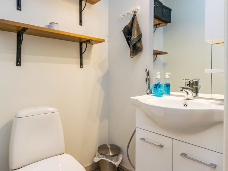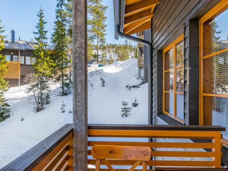 29km north of Kuusamo, Ruka village (Western Ruka) 180 m. Built in 2004, bedroom: 1 bed + bunk bed, upstairs: double bed (lower bed 170 cm), combined kitchen/living room, electric sauna. Downstairs 47 m² and upstairs 10 m². Apartment situated near Central Ruka area. Short walk to the slopes. Karhunvartijanlinna C22 is situated on the right side of Hiihtokouluntie road in building C. Apartment 22 is situated on the second floor, first floor is accessed also by the walkway behind the houses.