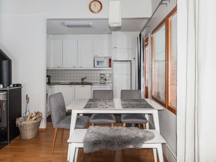 Area of the apartment 61 m²: downstairs 47 m², upstairs 14 m². Apartment situated near Central Ruka area, next to Ruka Village, at the foot of the front slope. Nearest ski lifts Talvijärvi and Kuru. Balcony towards Ski Stadium (no view).