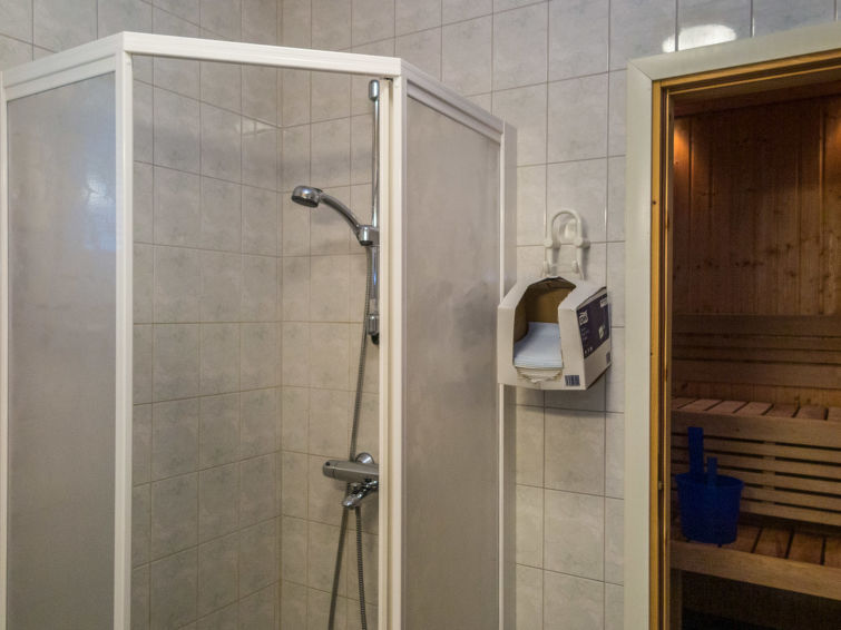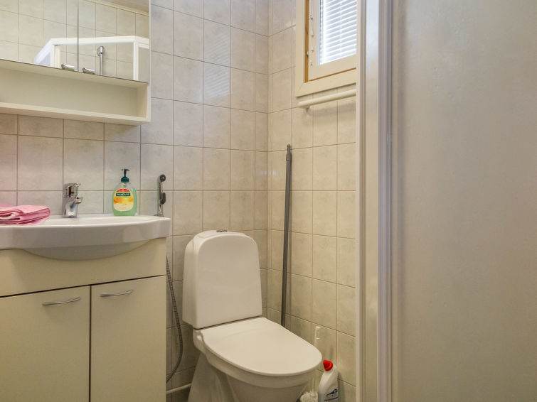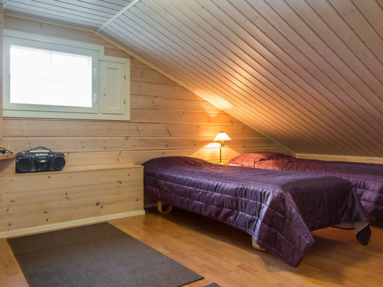 In the ground floor kitchen/living room, bed room 2 beds, washroom, sauna (elect. stove), open porch. Upstairs loft (30 sqm) with 4 beds. Child safety gate at the top of the stairs.