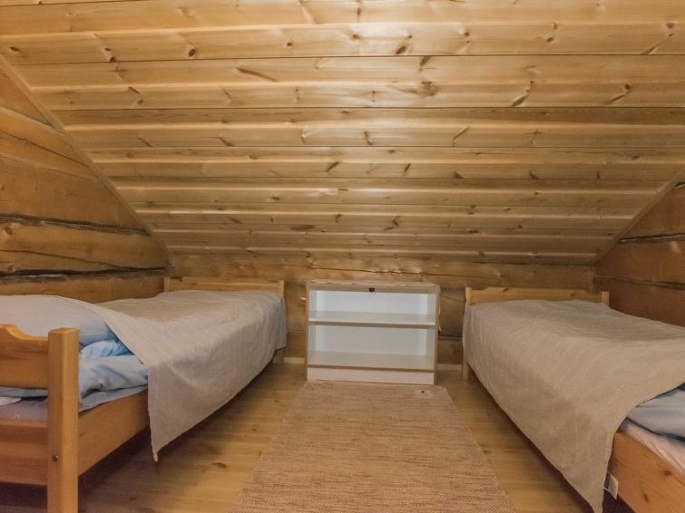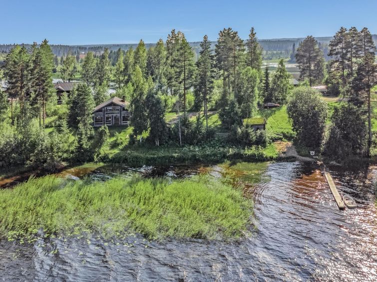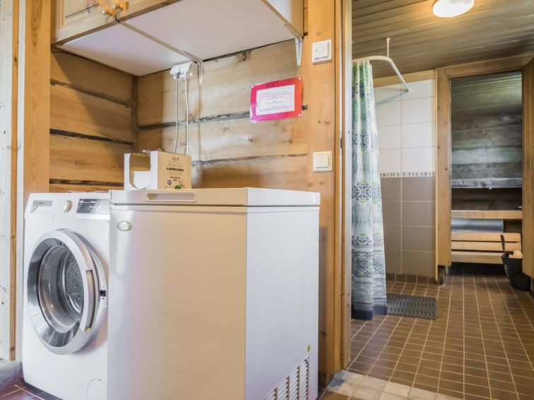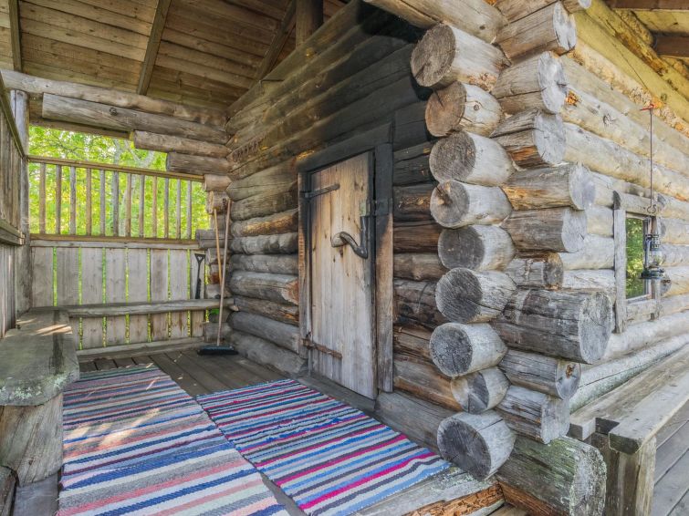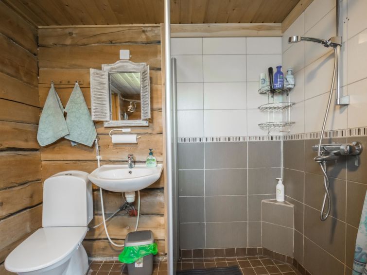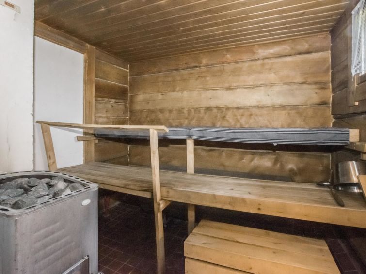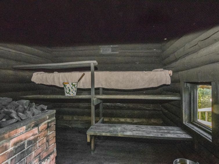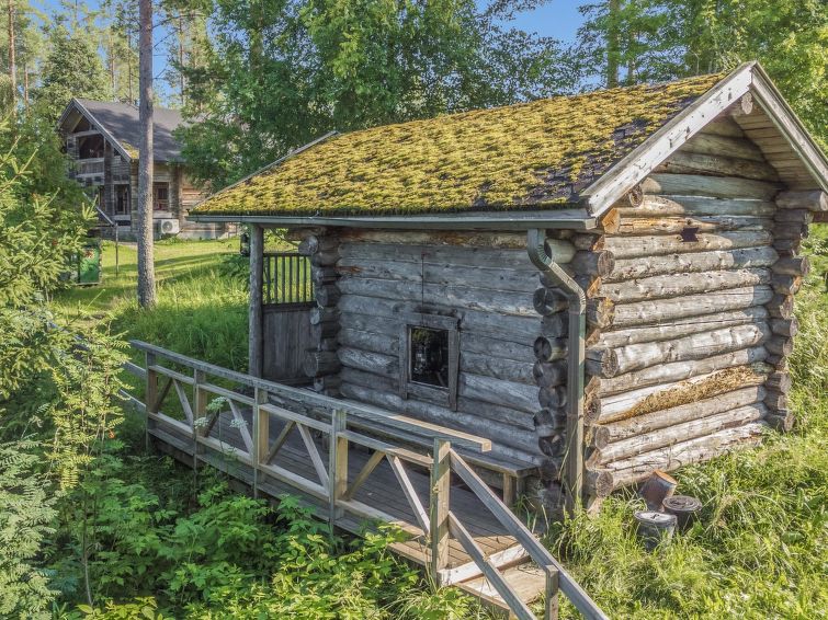 The two-storey log chalet 1994, on the ground floor a large kitchen-living room, bedroom with double bed and a cot, bathroom, dressing room, sauna, separate toilet and a terrace.