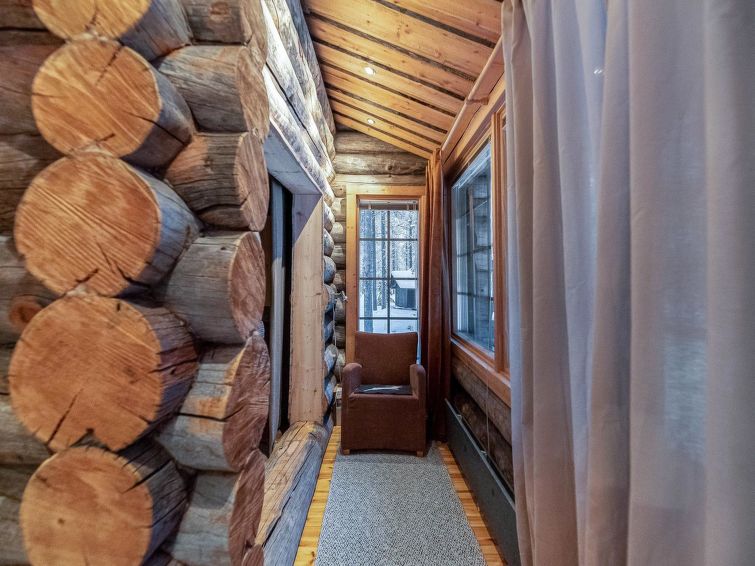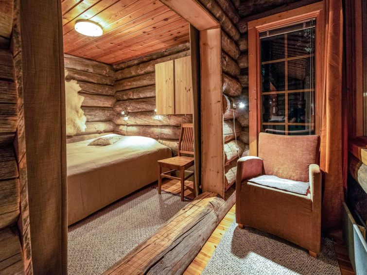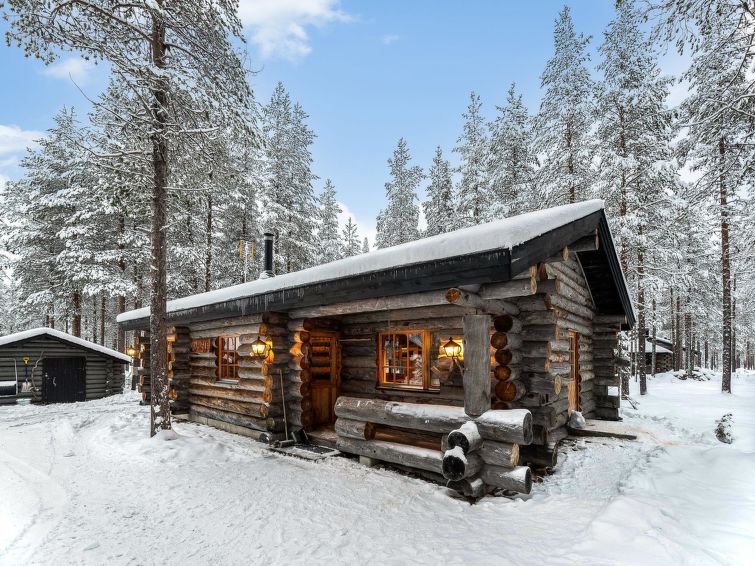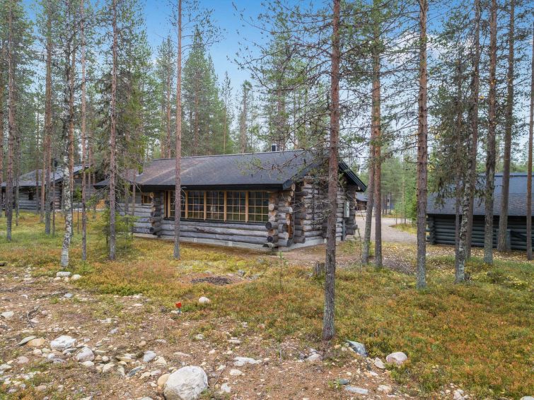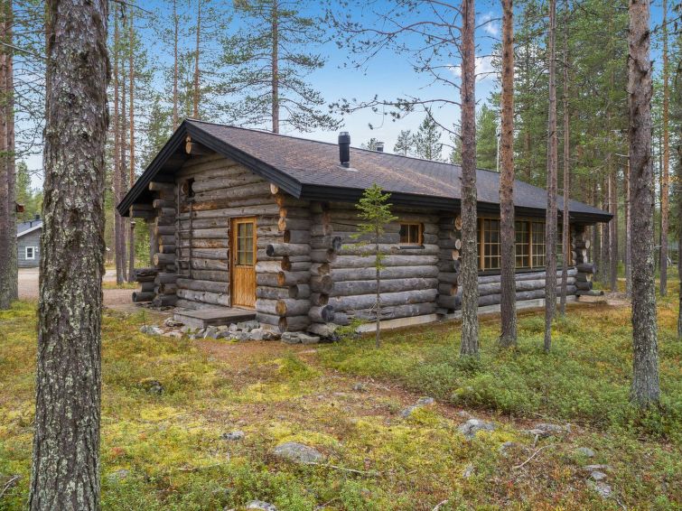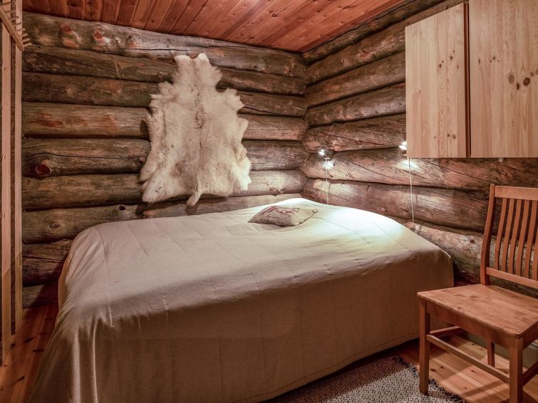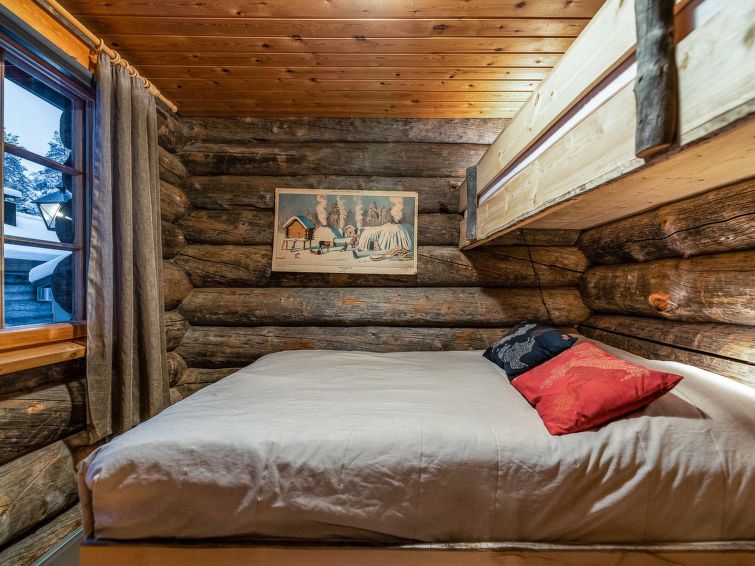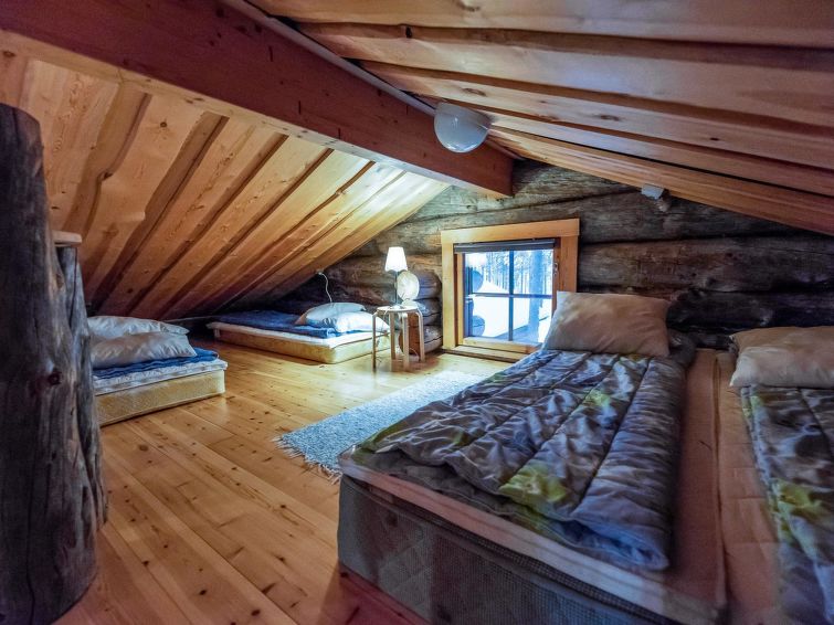 A separate log cottage located 165 km north of Rovaniemi in Ylläsjärvi village Palovaara area. Built 1990. Livingroom, kitchen, two bedrooms (one 160 cm wide bed and one with 140 cm wide bed), loft (14 m²) with 4 mattresses, electric sauna, washing room, storage room, toilet, feeding chair and potty. The second loft on top of the kitchen is not in use. Prices include final cleaning. Bed linen available for rent.