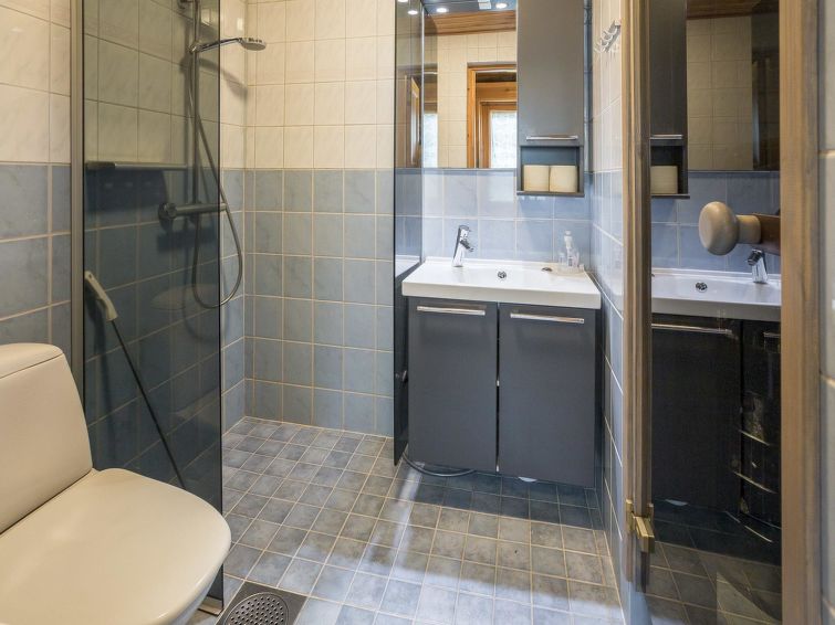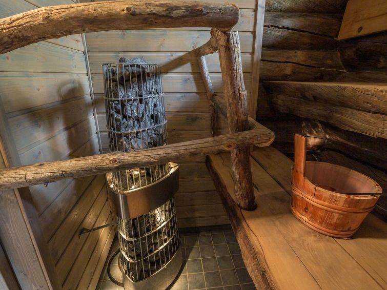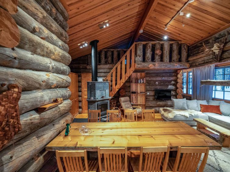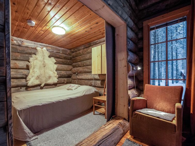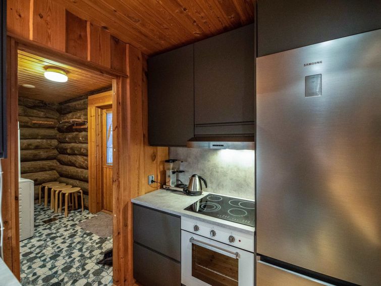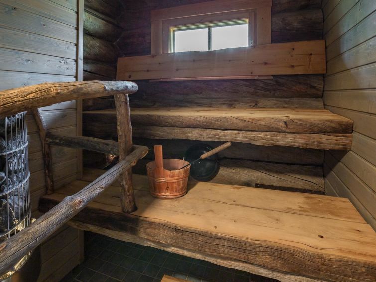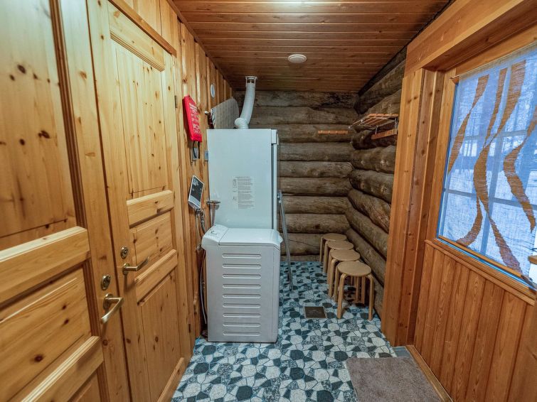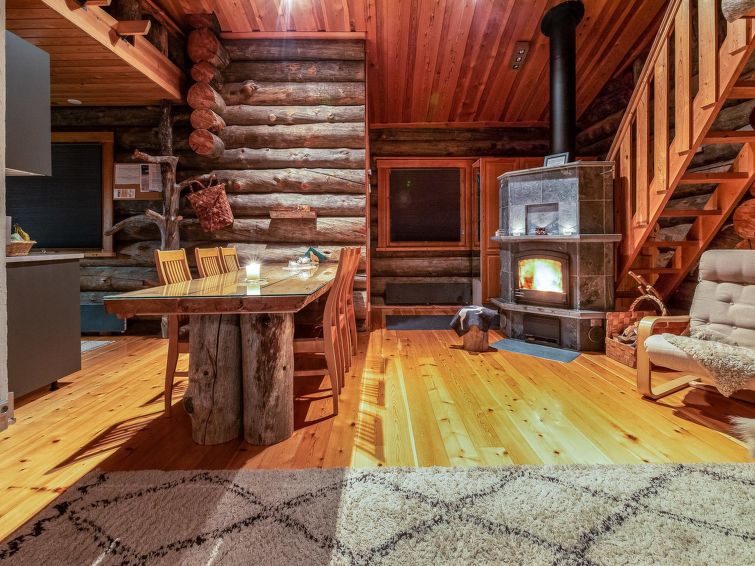A separate log cottage located 165 km north of Rovaniemi in Ylläsjärvi village Palovaara area. Built 1990. Livingroom, kitchen, two bedrooms (one 160 cm wide bed and one with 140 cm wide bed), loft (14 m²) with 4 mattresses, electric sauna, washing room, storage room, toilet, feeding chair and potty. The second loft on top of the kitchen is not in use. Prices include final cleaning. Bed linen available for rent.