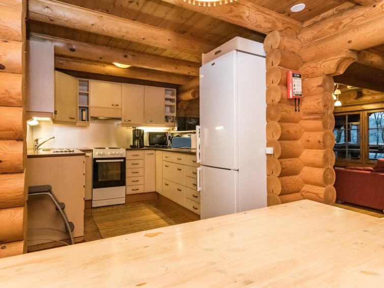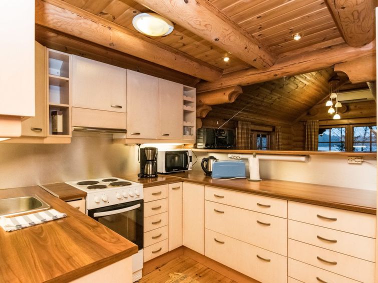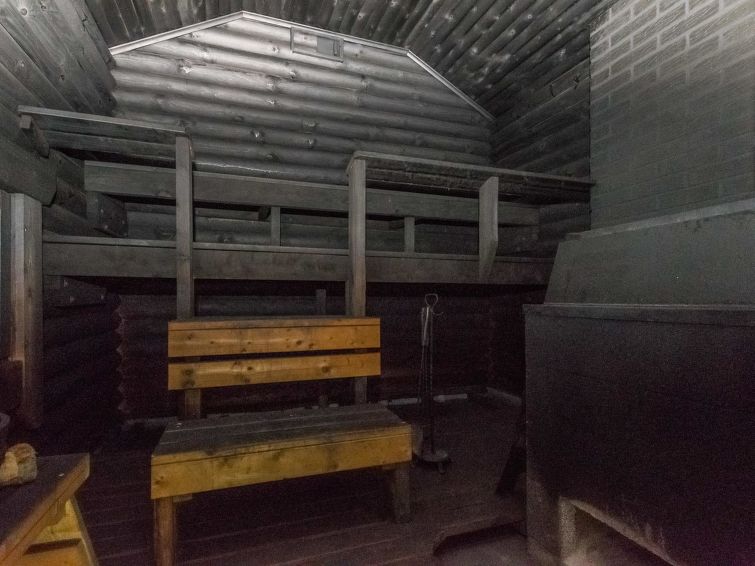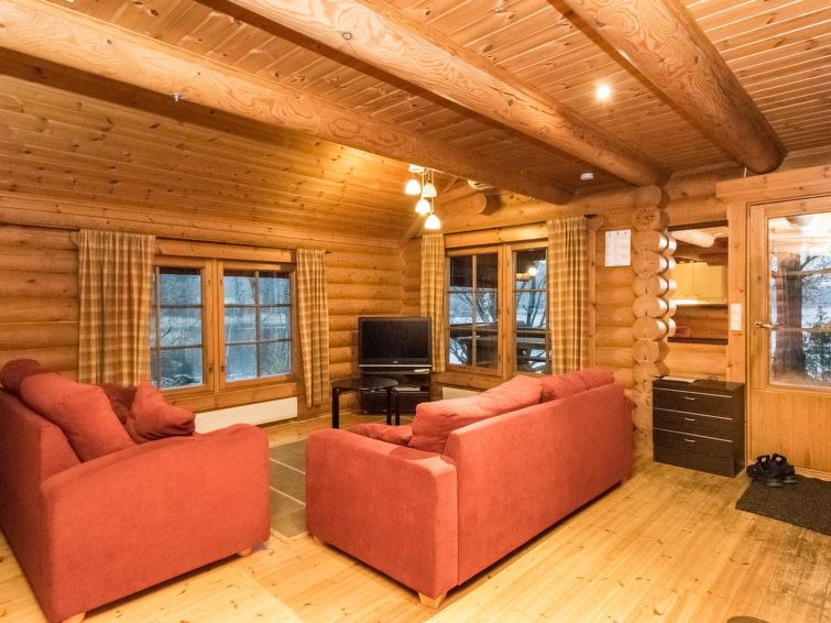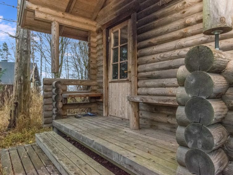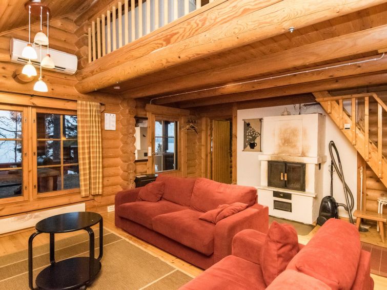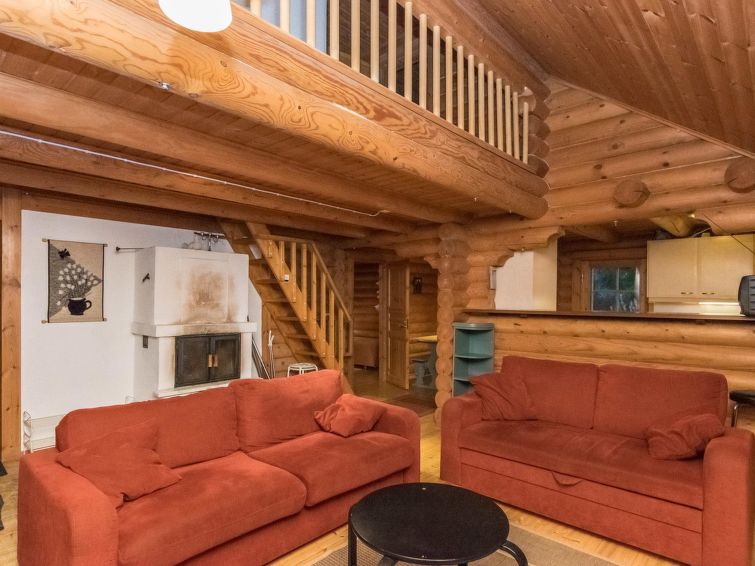Log cabin 1994, living room / kitchen with sofa bed, 2 bedrooms with 2 beds in each (one downstairs, another upstairs), sleeping loft with spreadable sofa bed, wood-heated sauna, washroom (WC), covered porch, balcony. Smoke sauna available for rent.