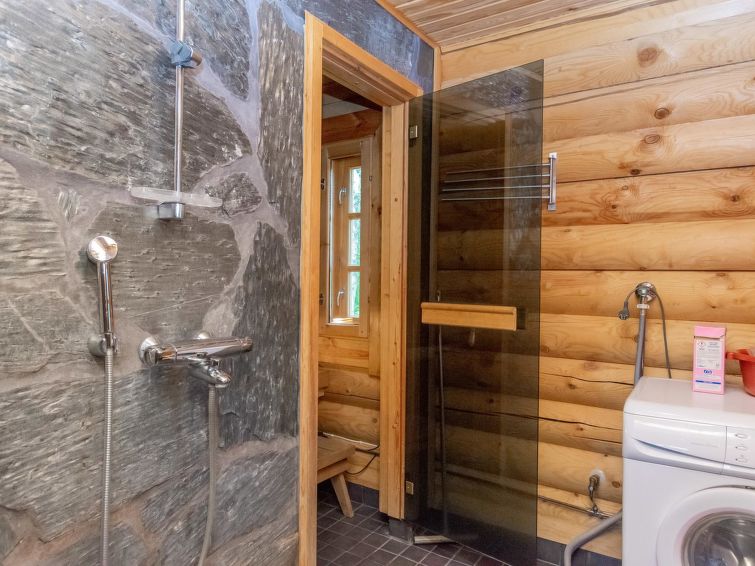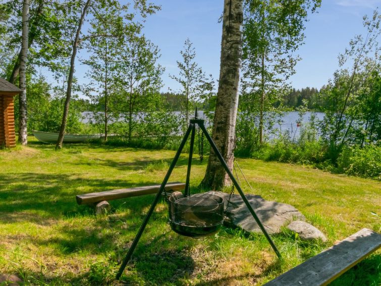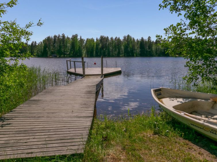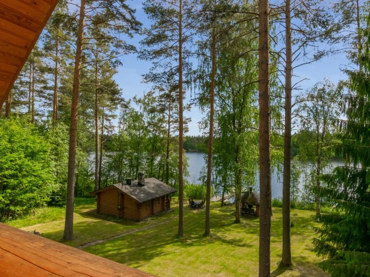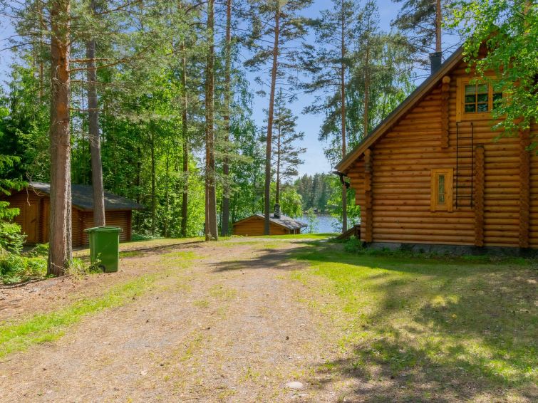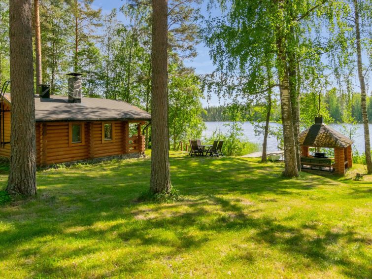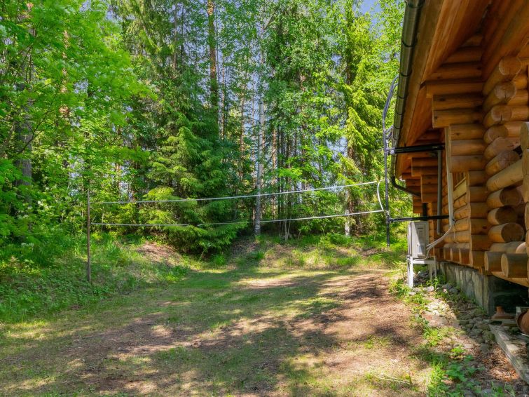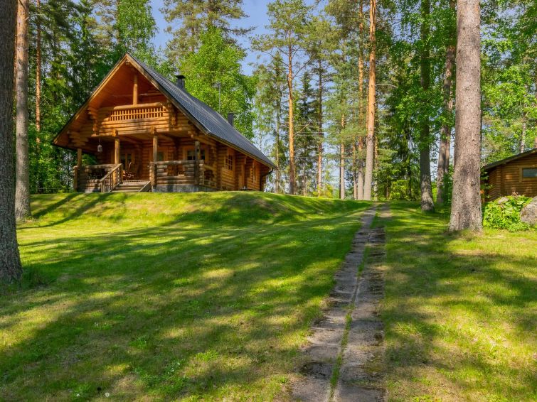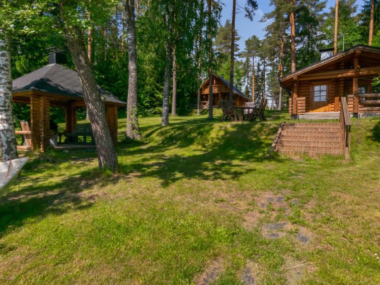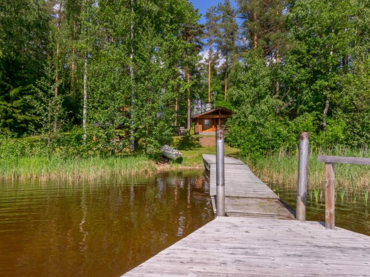 Separate outbuilding/storeroom; outbuilding has double bed, electric light, electric heater. Storeroom is used by owner. Roofed grill. Homely 2-storey cottage on gently sloping plot. Large grassed yard area, slabs on pathways, plot (4400 m2) has mixed forest. Large jetty for larger boats as well. Neighbours on both sides 50 m, trees between. Washing machine (also dries). Outboard motor for rent.
