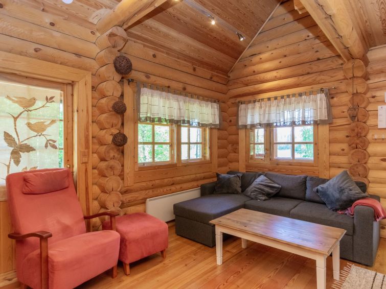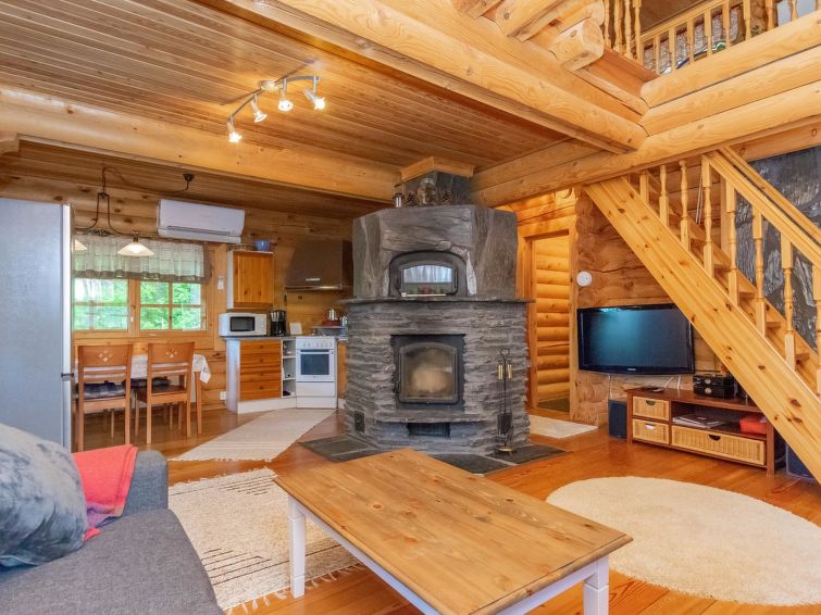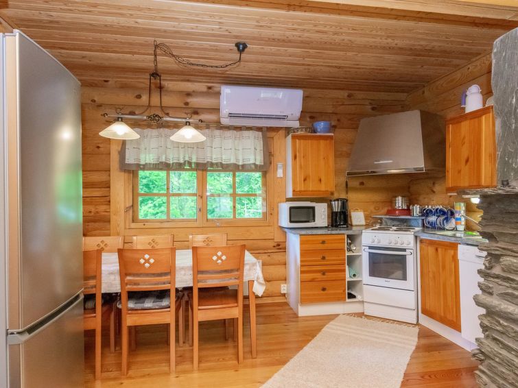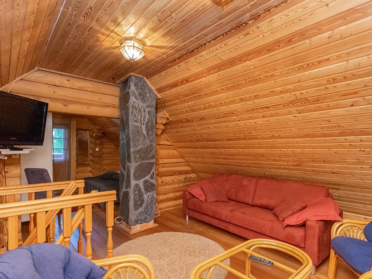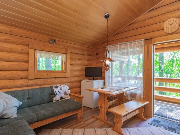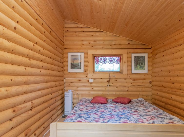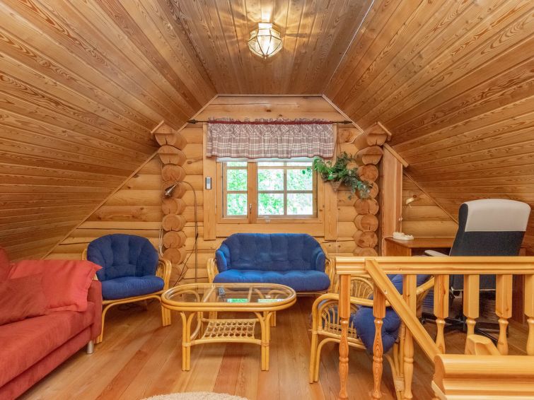 Log cottage 2004, living room/kitchen with sofa bed, bedroom 1 bed. Upstairs 2 beds and extendible convertible sofa/bed, sauna (electric stove), washroom, WC, terrace, balcony. Air source heat pump.