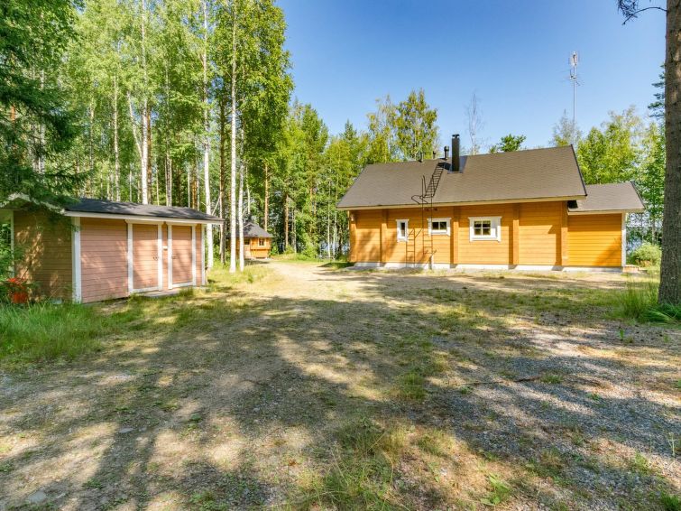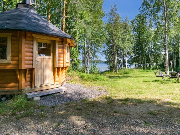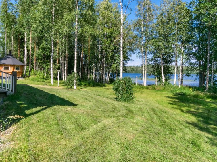 Log cottage by lake Iso-Kontunen. Peaceful plot, flat lawn yard, trees around.
