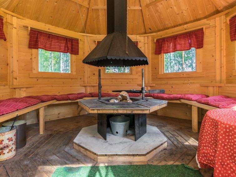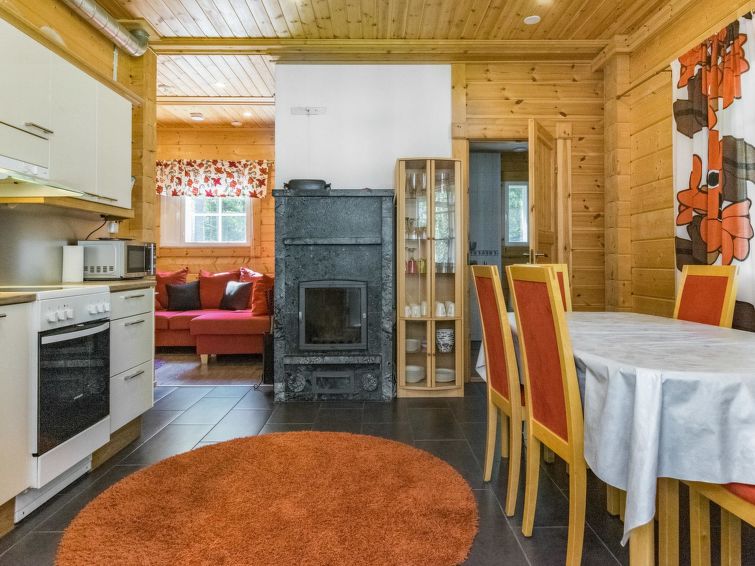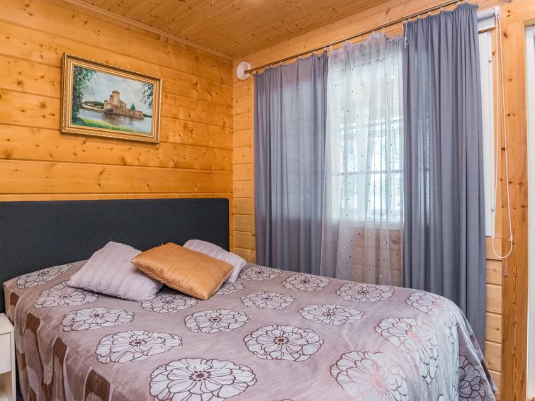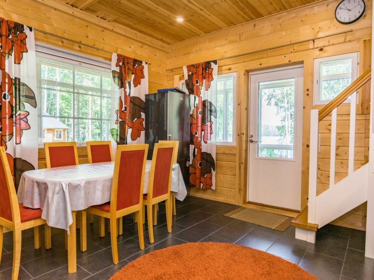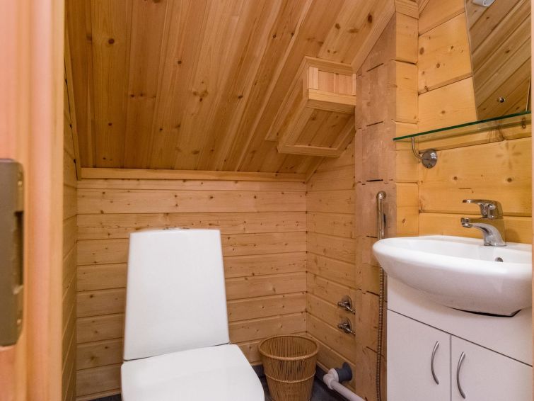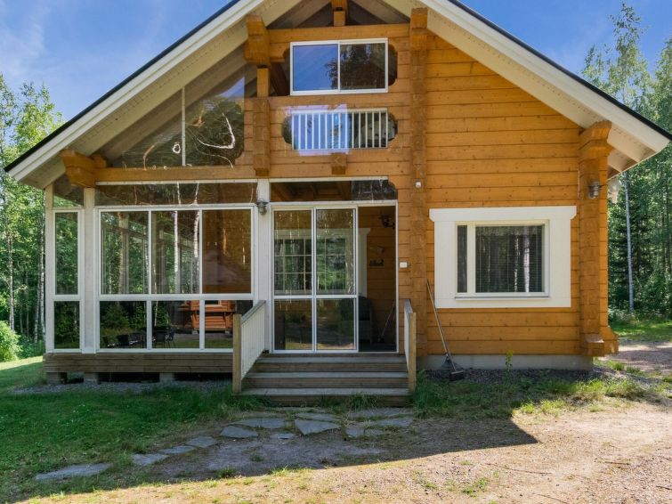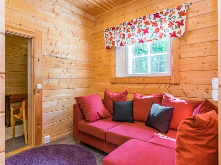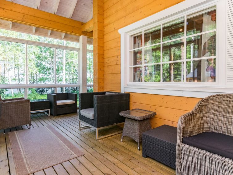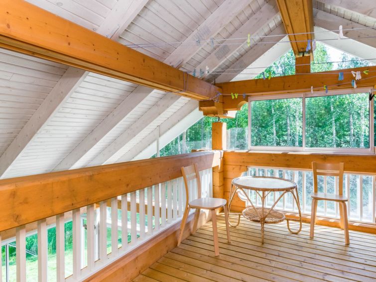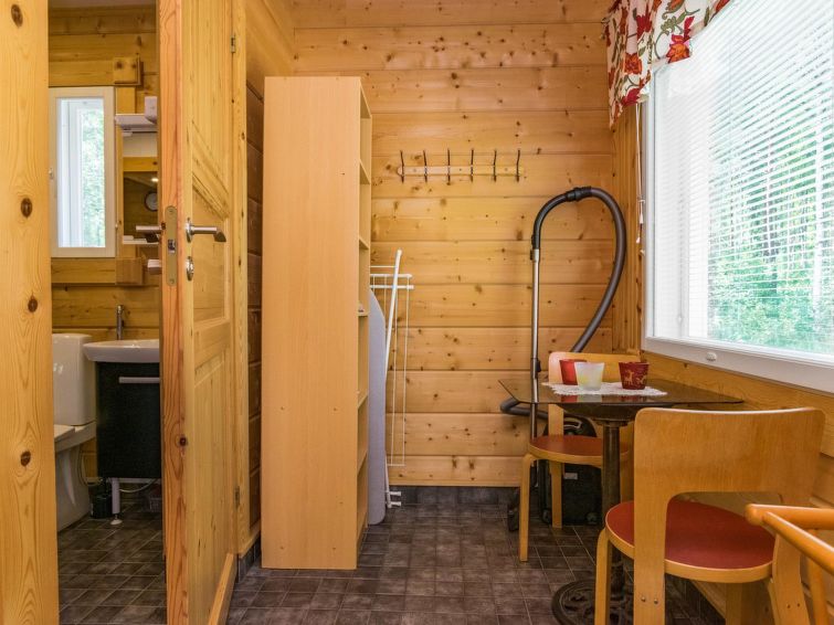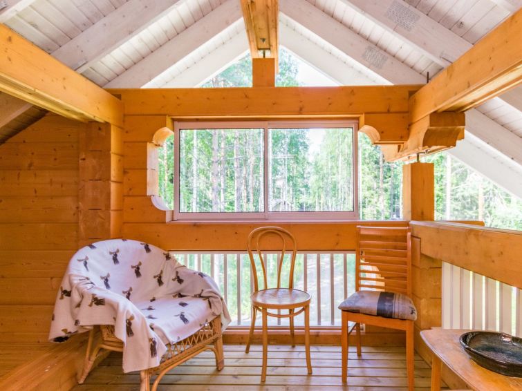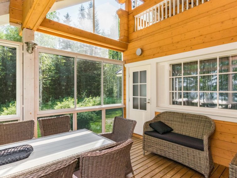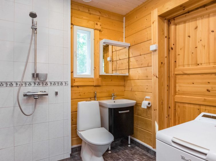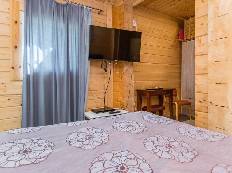 Log cabin 2015, ground floor: kitchen-living room, bedroom (10 m²) double bed (140 cm wide), electric sauna, shower room (toilet), dressing room, entrance hall, glazed terrace 30 m².