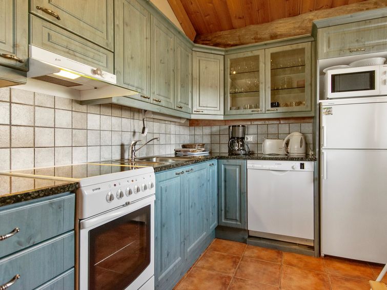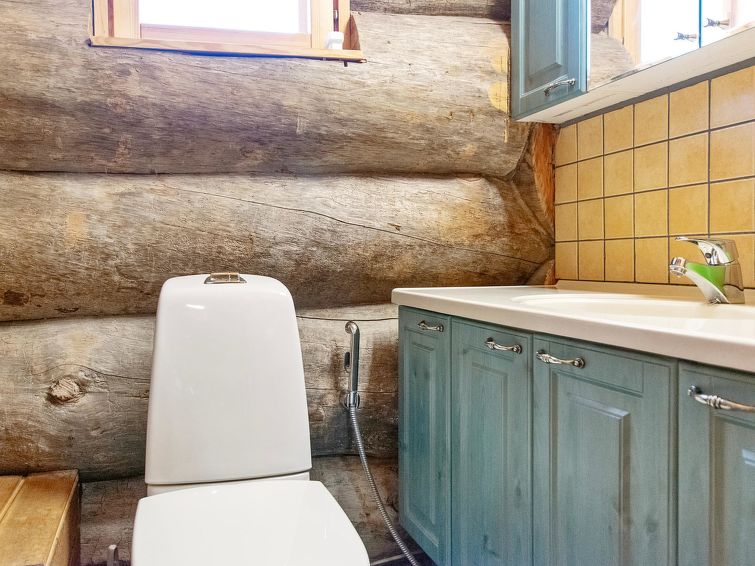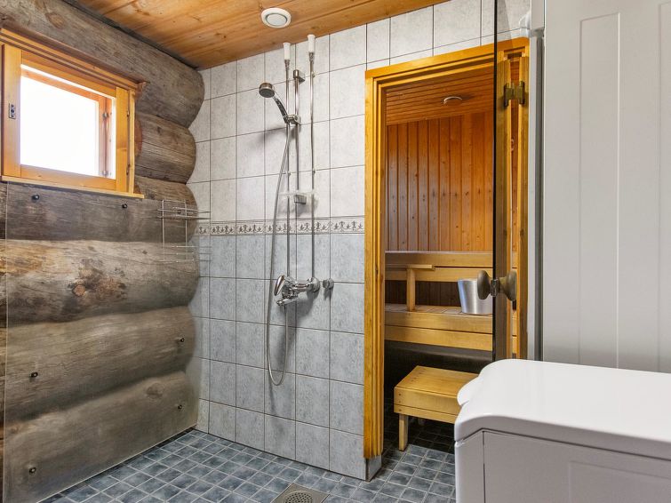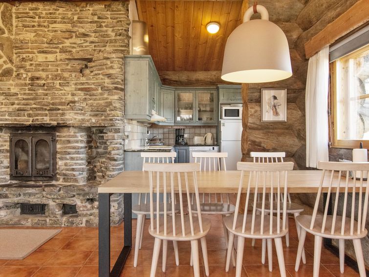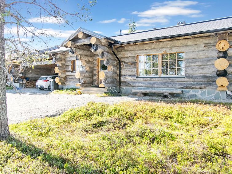 Silver log semi-detached apartment in Kaunispään Etelärinne II area 2,3 km from the center of Saariselkä, built in 2006. Kitchen-living room with fireplace, a bedroom with a double bed, a bedroom with 2 beds, loft with 4 mattresses (low room height, steep stairs), electric sauna, shower room and toilet.