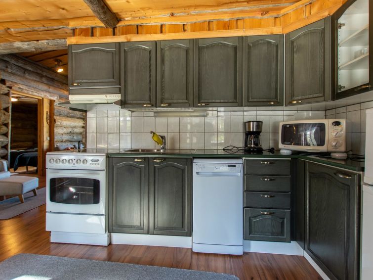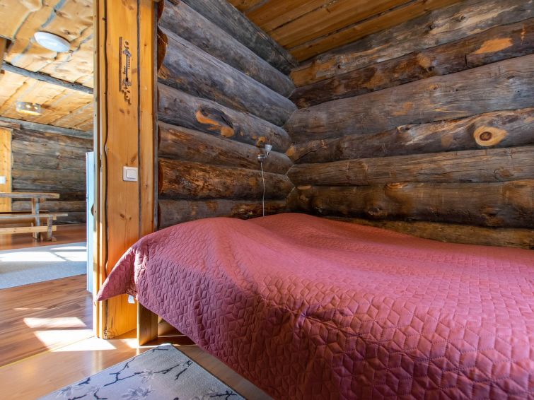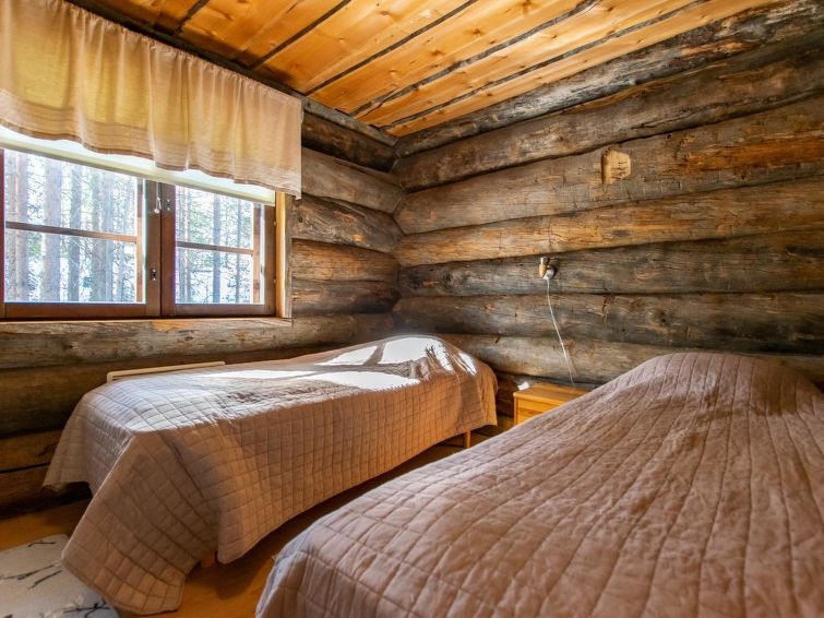 28 km north of Kuusamo, Ruka 4,5 km. A snag pine cottage; Livingroom/kitchen, bedroom 1: double bed, bedroom 2: two beds, bedroom 3: two beds, loft with 4 mattresses (steep stairs), sauna and bathroom.