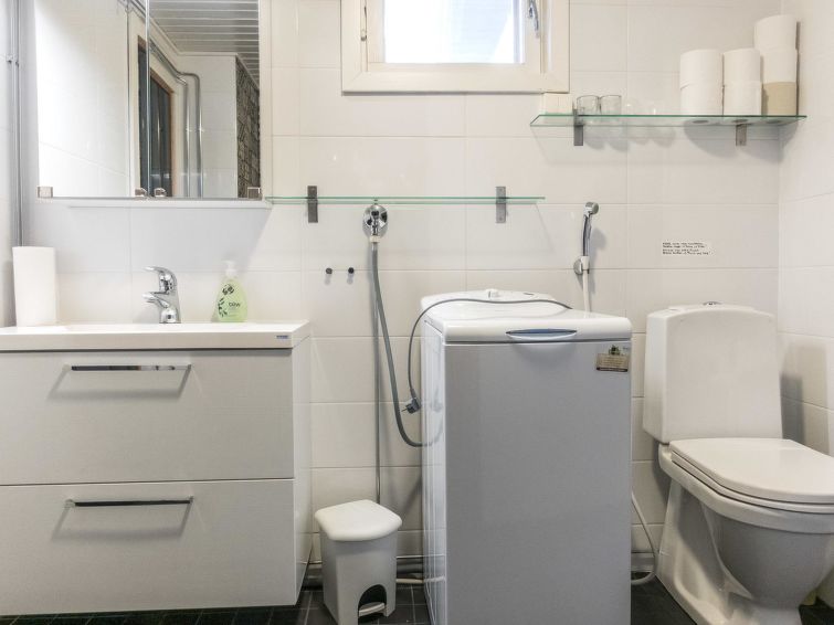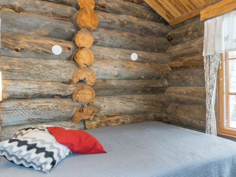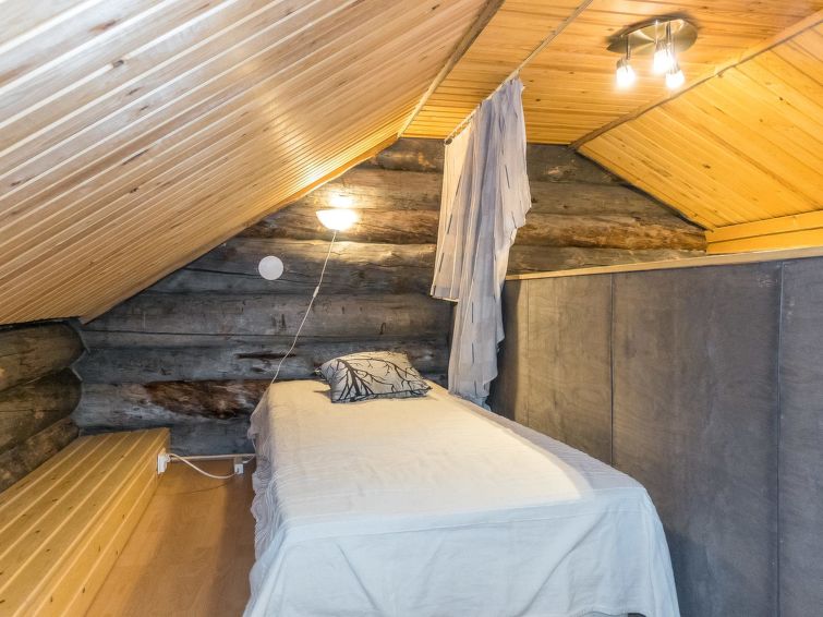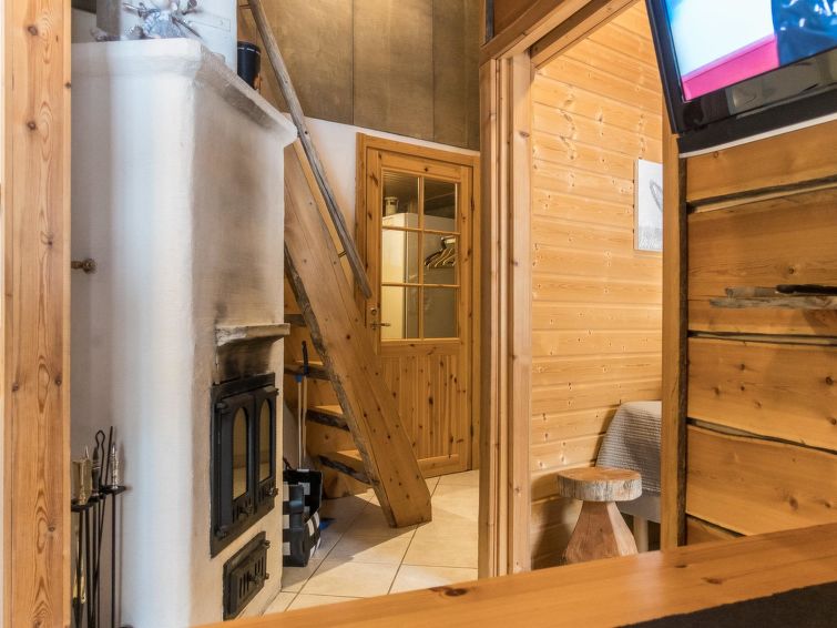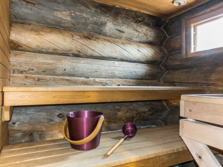Small silverlog apartment in a small row house, built in 1999, renovated later. Living room, kitchenette, bedroom with double bed (width 140 cm), loft (steep stairs, floor area of 16 m²), 2 beds (made upon a double bed), sauna (electric stove), bathroom, terrace.