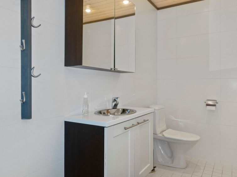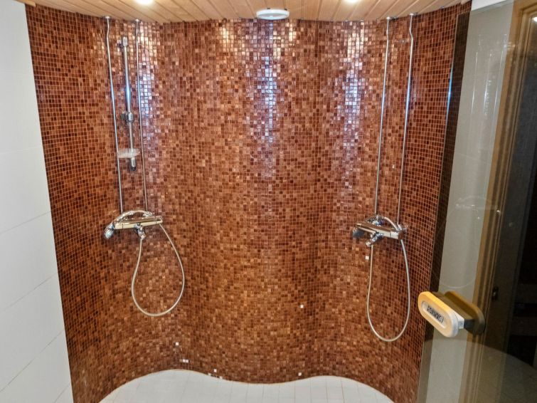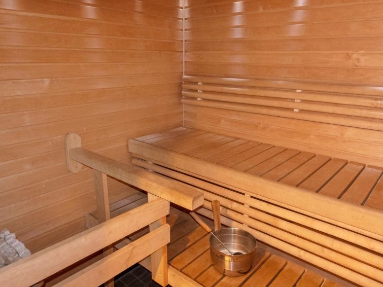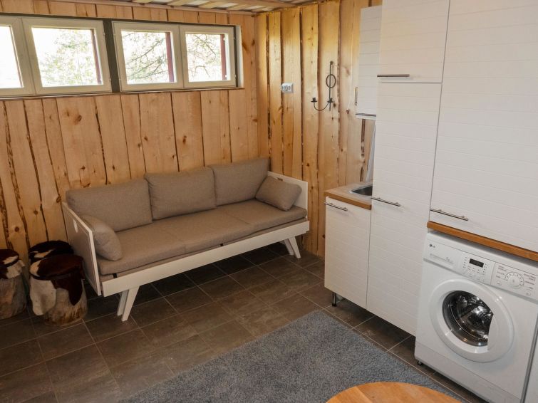 On the ground floor there is sauna, washroom, bedroom with 2 beds (no window), living area/utility room, spreadable sofa and separate WC.
