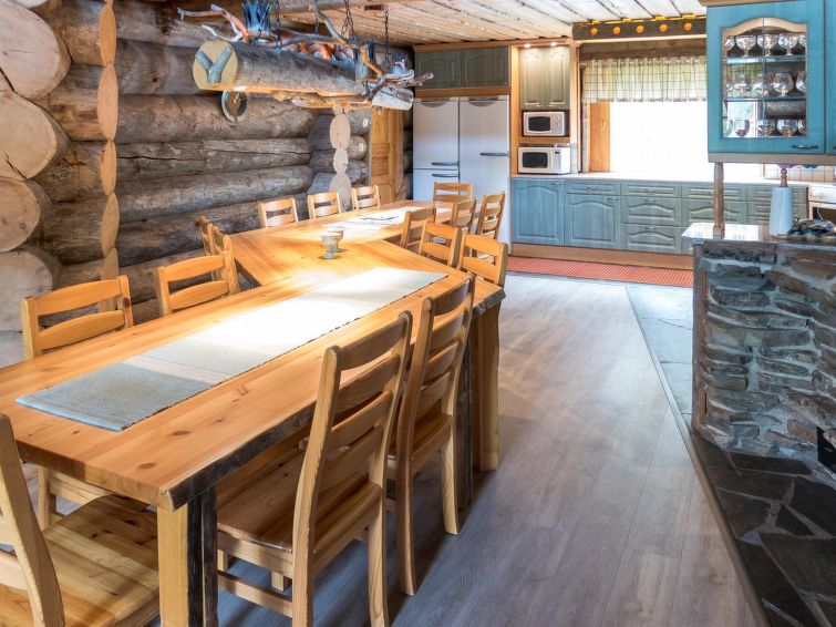 23km north of Kuusamo, Ruka 6km, Lake Iso-Veskajärvi 40 m, stony/mudy beach in natural condition. 2-storey log cottage, built in 2003. Downstairs there are 3 bedrooms, combined living room/kitchen, sauna, shower and toilet. Upstairs there are 1 bedroom and 5 small bedrooms and toilet.