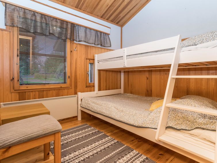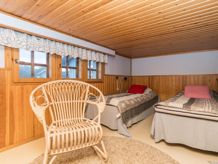25km north of Kuusamo, Ruka village (Western Ruka) 2,2 km, Lake Talvijärvi 20m, shallow beach. Plank-built apartment, built in 1989, bedroom 1: double bed, bedroom 2: convertible sofa, loft: 4 beds, combined kitchen/living room, electric sauna. Downstairs 50 m² + loft 14 m².