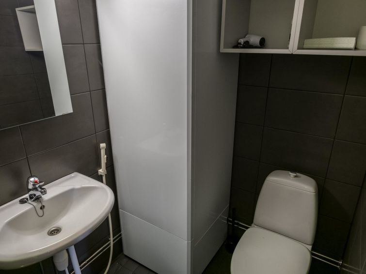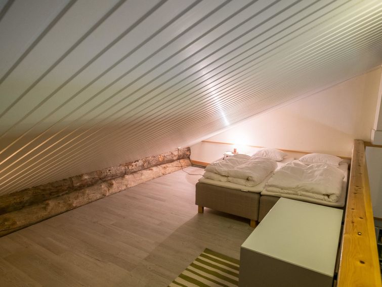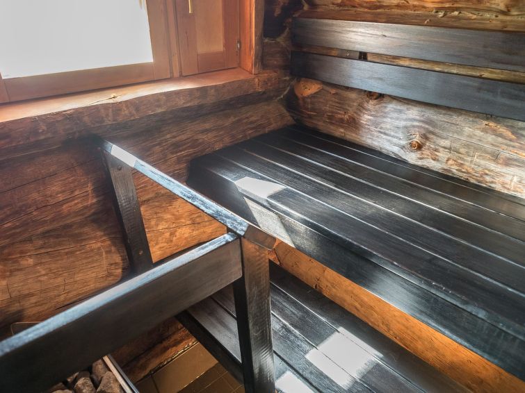 Stylish log house apartment within walking distance from Levi Center. The apartment is located at the end of the row house. Downstairs a bedroom with two separate beds can be found. In addition there is a kitchenette, living area and during 2019 renovated bathroom and toilet and a sauna. The balcony accommodates three people in separate beds.