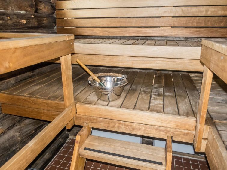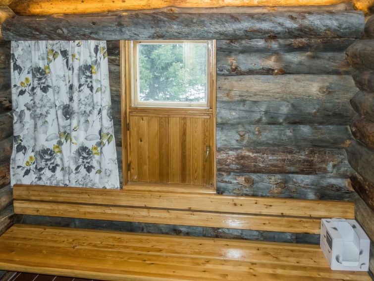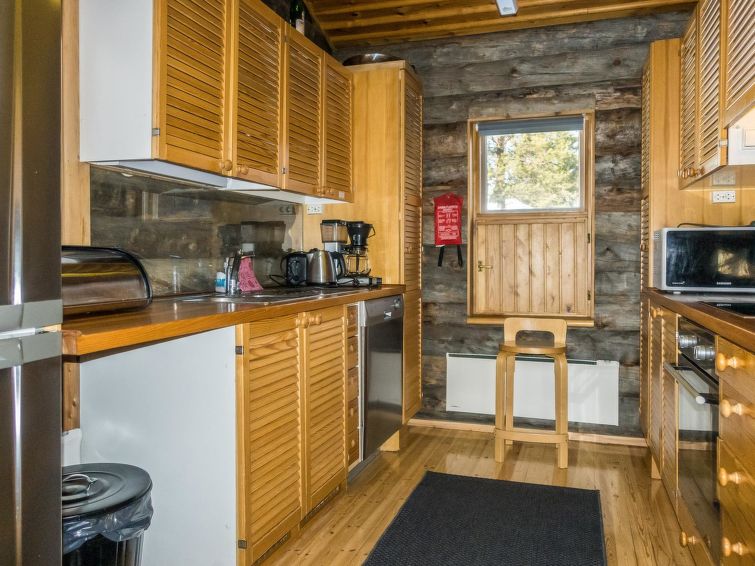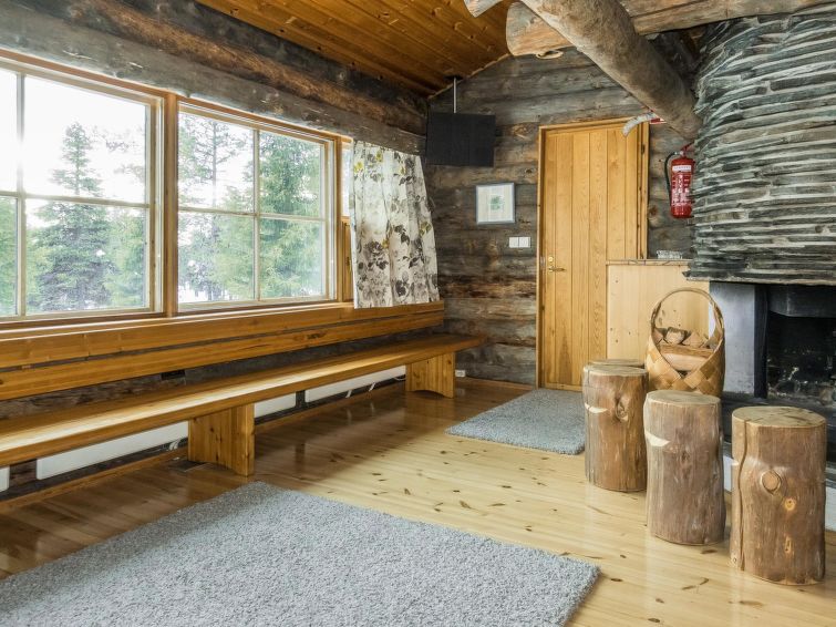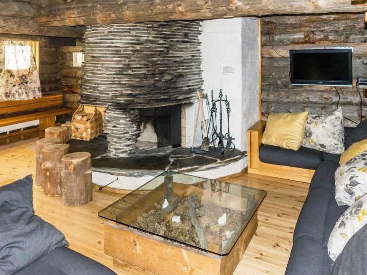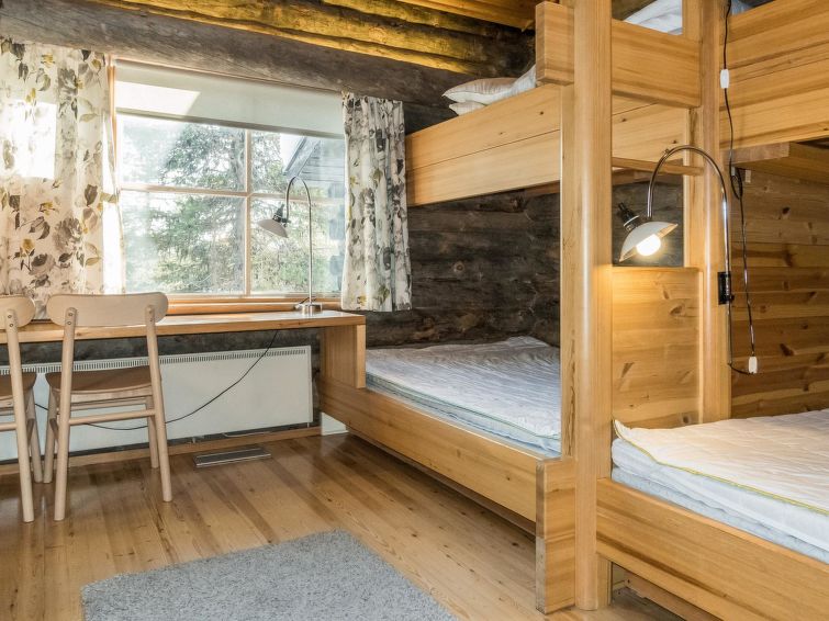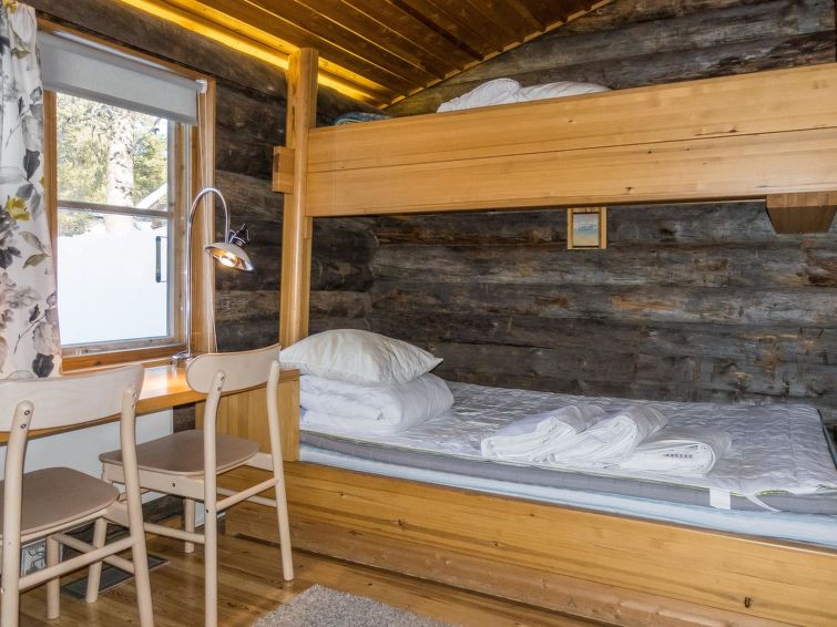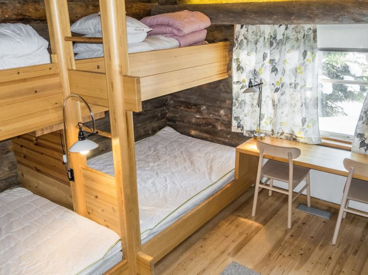 Living room with a fireplace made of natural stone, kitchen/dining area, 2 bedrooms with 2 bunk beds (lower bed 140 cm wide, upper bed 80 cm wide), a bedroom with a bunk bed (lower bed 140 cm wide, upper bed 80 cm wide), loft with 2 mattresses, electric sauna, shower room/toilet and toilet. Features include also basic set of cutlery and cookware, coffee maker, water kettle, toaster, projector screen in tv-room, iron and ironing board and hair dryer.