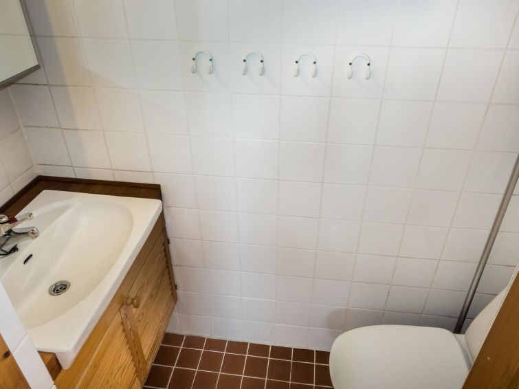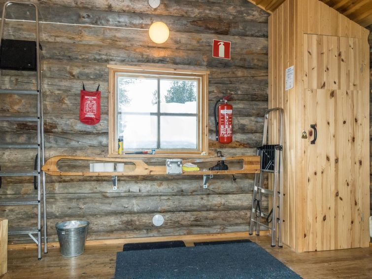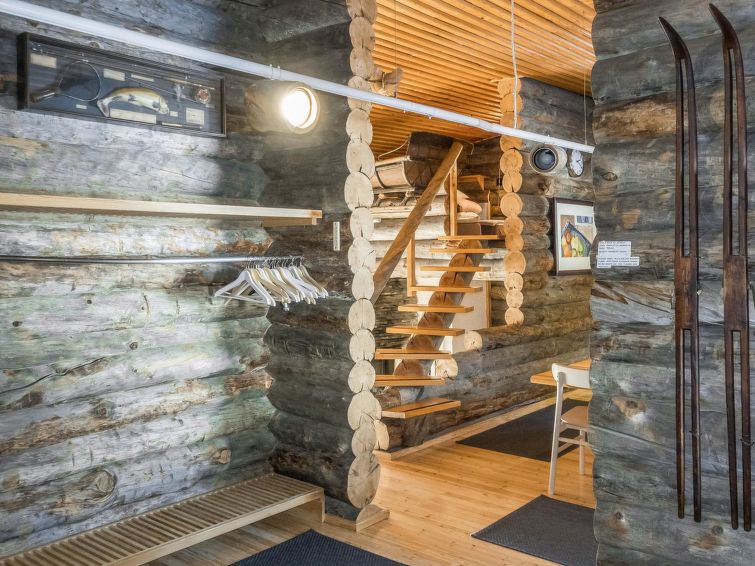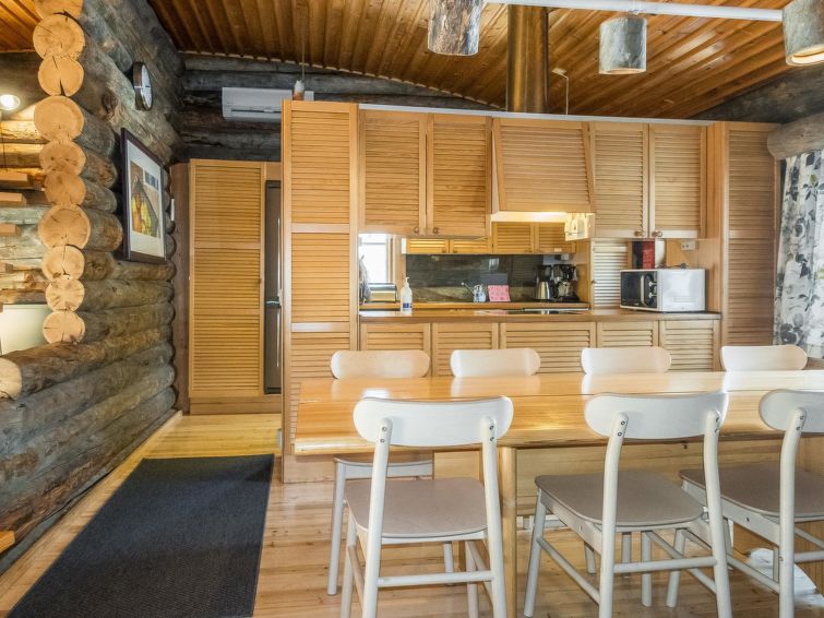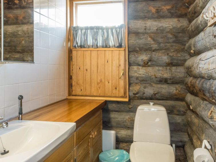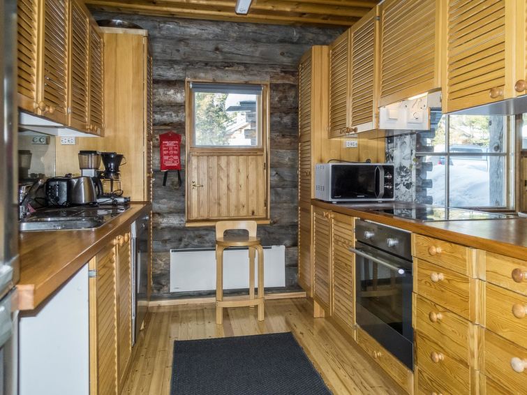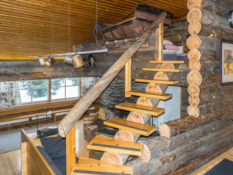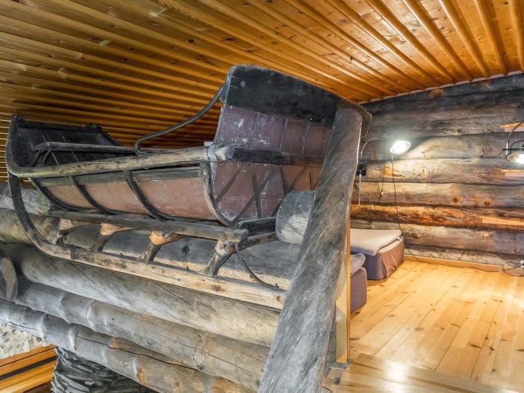 Living room with a fireplace made of natural stone, kitchen/dining area, 2 bedrooms with 2 bunk beds (lower bed 140 cm wide, upper bed 80 cm wide), a bedroom with a bunk bed (lower bed 140 cm wide, upper bed 80 cm wide), loft with 2 mattresses, electric sauna, shower room/toilet and toilet. Features include also basic set of cutlery and cookware, coffee maker, water kettle, toaster, projector screen in tv-room, iron and ironing board and hair dryer.