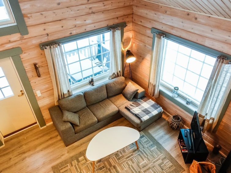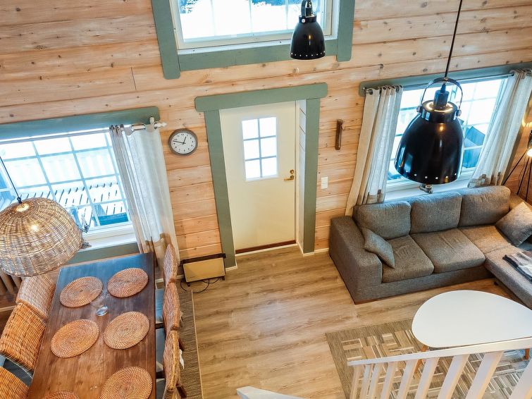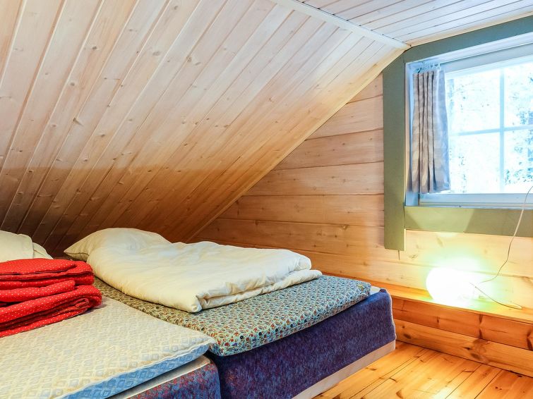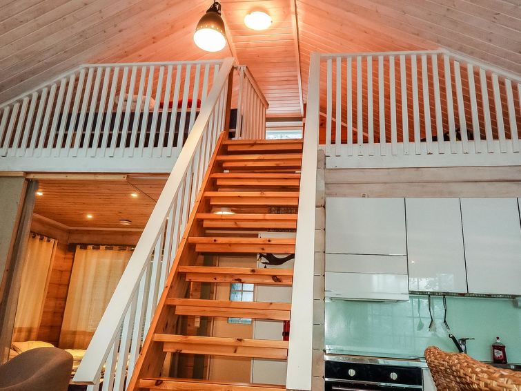 Wooden cabin, living room/kitchen, curtain-separated alcove in connection with the living room/kitchen, 2 beds in alcove, 2 box springs in the loft, steep stairs to the loft, washroom/WC and covered terrace.