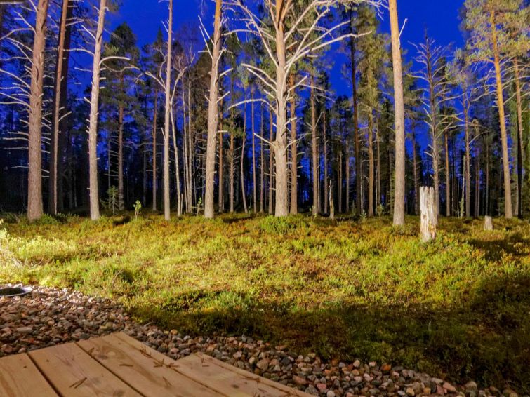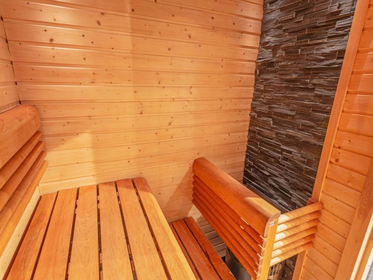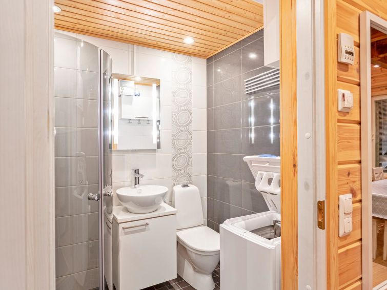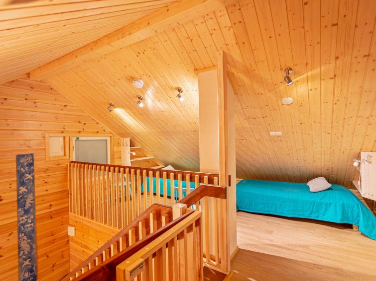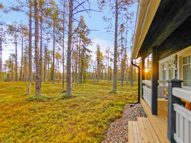 40km northeast of Kolari, Lake Ylläsjärvi 3km, beach 4,5km. A timber semi-detached house apartment built in 2013, kitchen-living room, one bedroom with double bed, upstairs (sloping ceilings, highest point over 160 cm) with 2 separate beds and a bed sofa, toilet. Sauna (electric), bathroom/wc, carport, ski tuning room (shared with another apartment). NOTICE! It is not allowed to bring hot tub to cottage or make a campfire to yard is forbidden. Please don´t take firewoods to forest outing .Fiber optic connection 200/200MB.