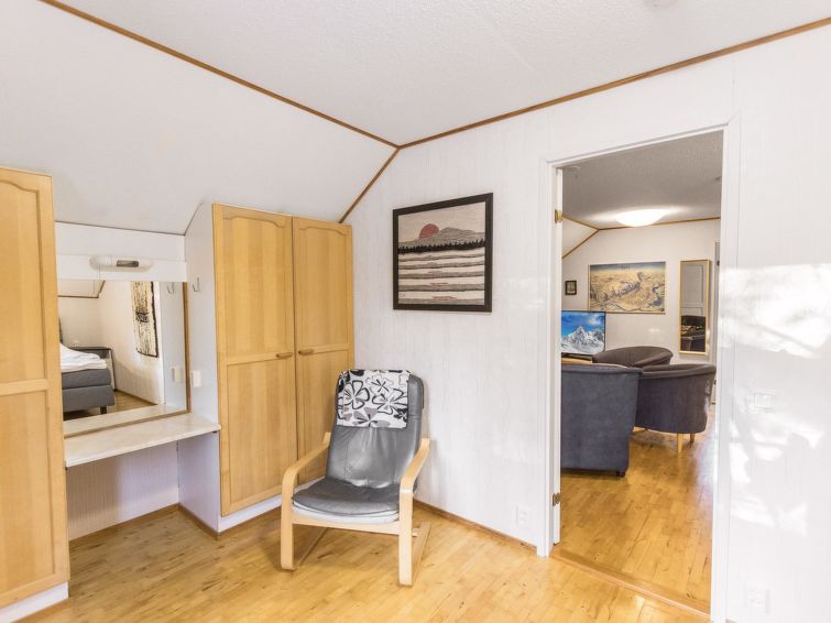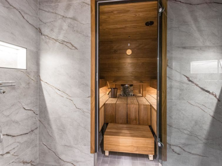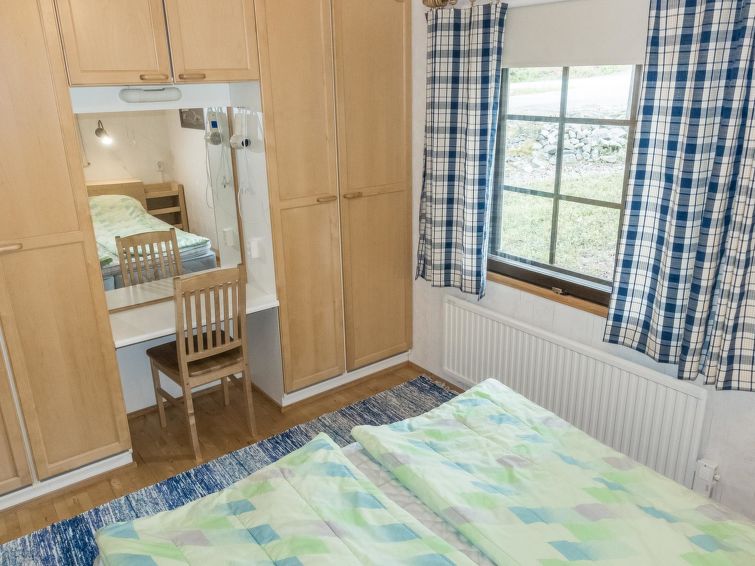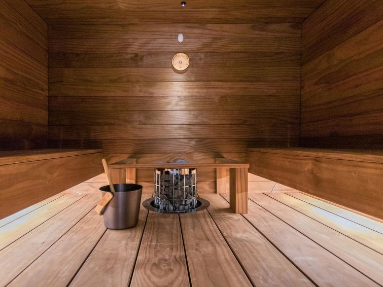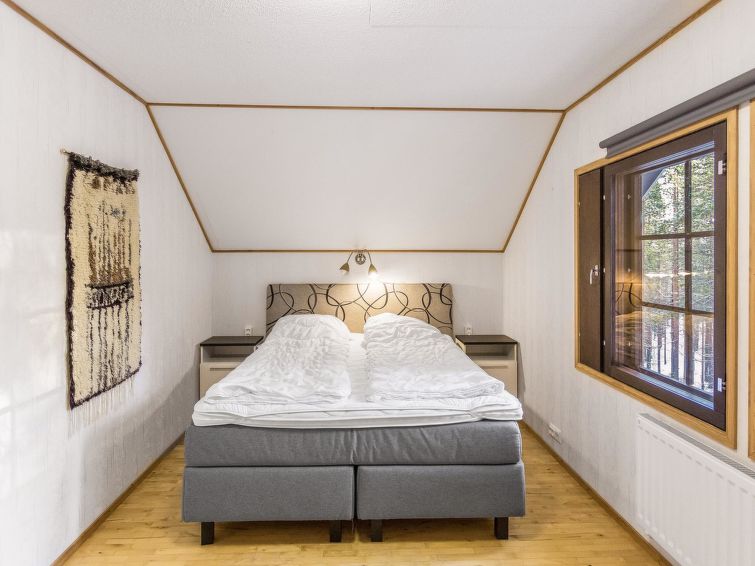 On the ground floor living room/kitchen, bedroom with two beds, another bedroom with double bed (2 beds made into a double bed with common mattress pad), sauna, washroom and separate WC.