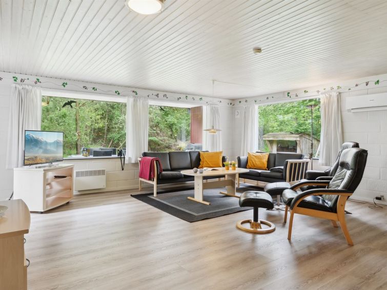 Enmannsbolig, bygget i 1973. 3.2 km fra sjøen. Privat: uberørt tomt 2'500 m2. Grill, lekeplass (huske). I huset: trikkpolinje, vaskemaskin, tørketrommel. Parkering ved hbrukt. Daglivarehandel 1 km. Golfbane 2 km. Eieren godtar ikke noen ungdomsgrupper.