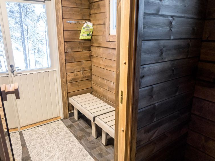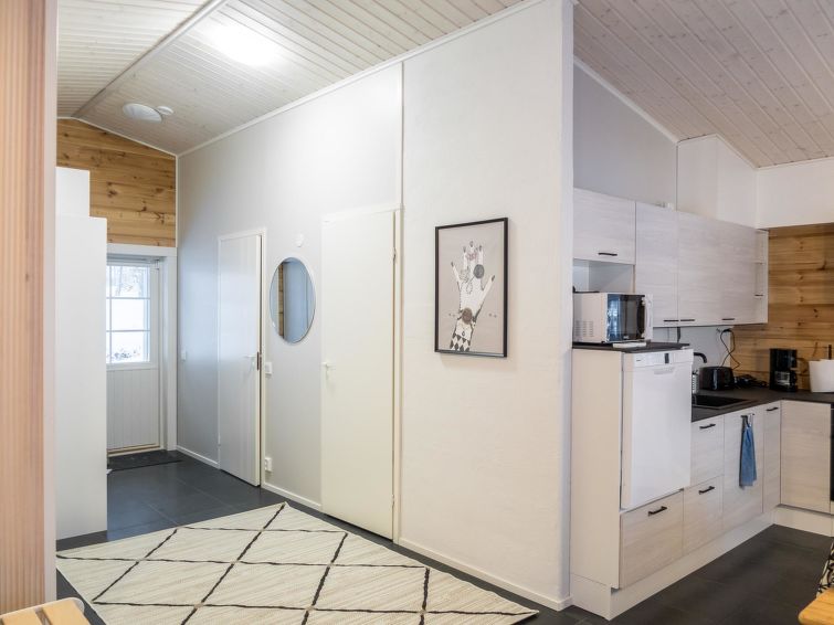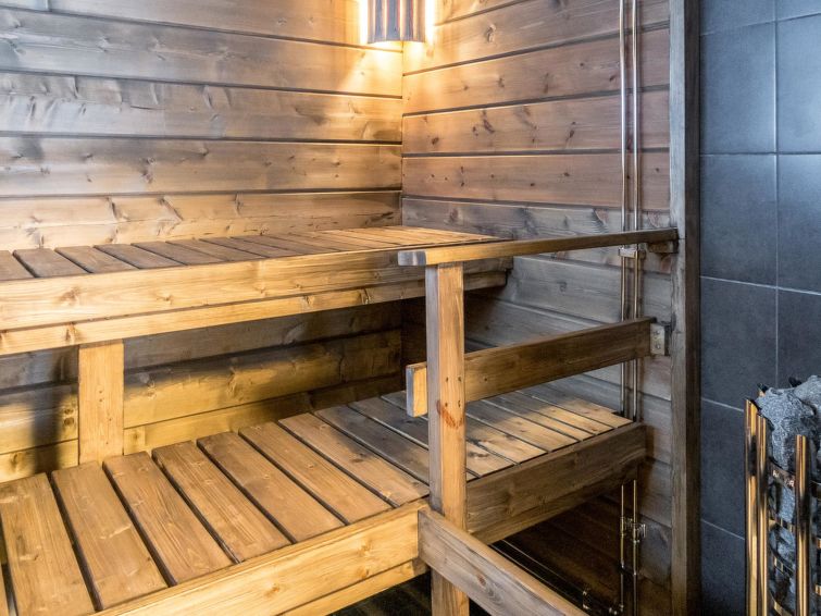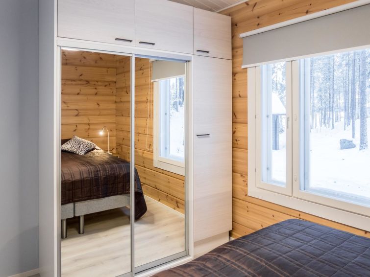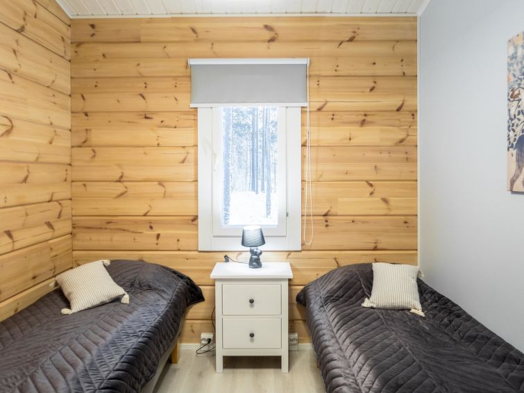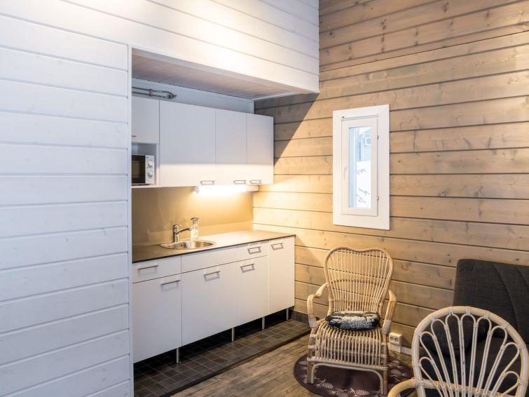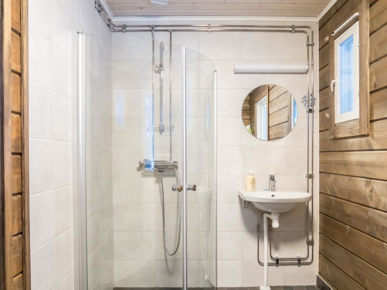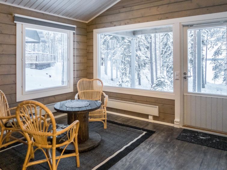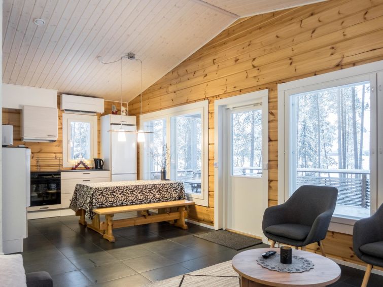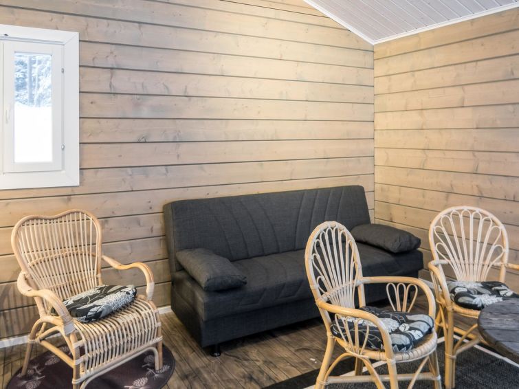 The area of the main house is 62 m², with a spacious kitchen/living room with large windows overlooking the lake and the forest landscape. Dining set for 6 in the kitchen. Two separate bedrooms, one with a double bed and wardrobes. In the second bedroom, separate beds for 2. The living room has a sofa bed for 1-2 guests. Shower/toilet, washing machine and drying rack in the washroom. Entrance hall with wardrobes, access from the back to a large terrace with garden furniture and a grill available in the summer. In the main cabin, underfloor heating, air-to-air heat pump and ventilation unit.
