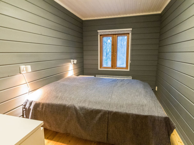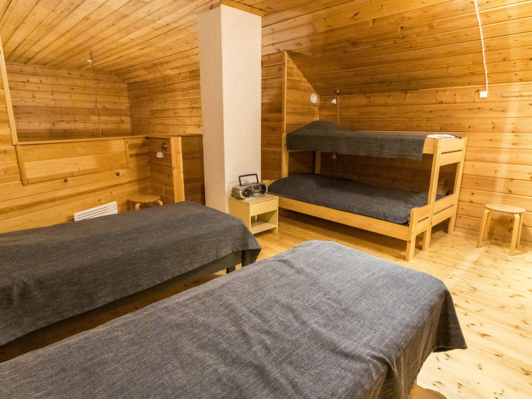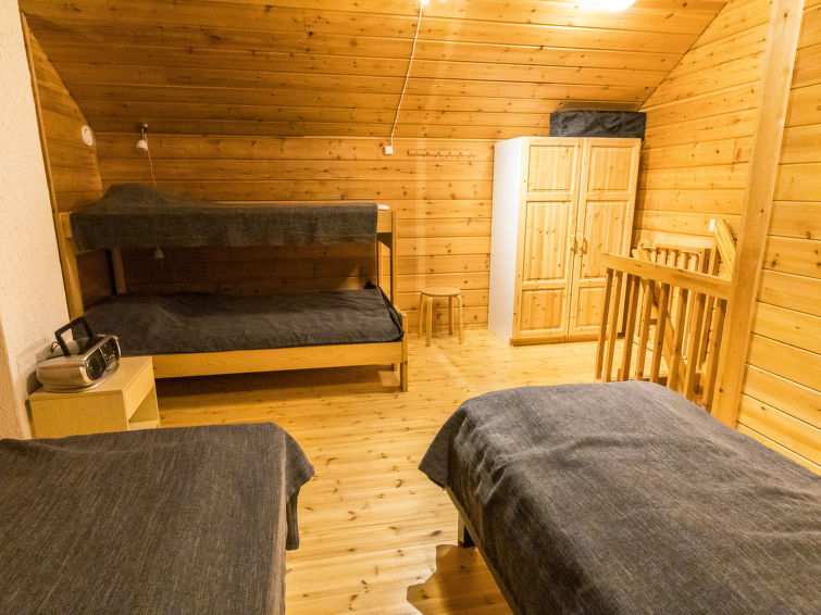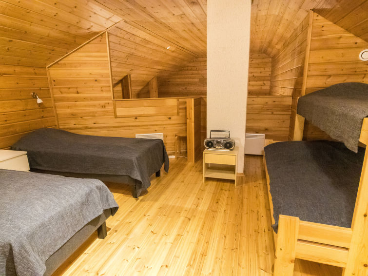 Combined living room/kitchen, downstairs 2 bedrooms, both with 2 beds, upstairs open loft has 2 single beds and a bunk bed (bottom bed 120 cm wide). Sauna, washroom/wc, separate toilet, covered terrace, storage.