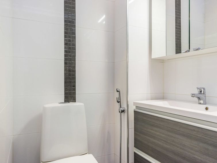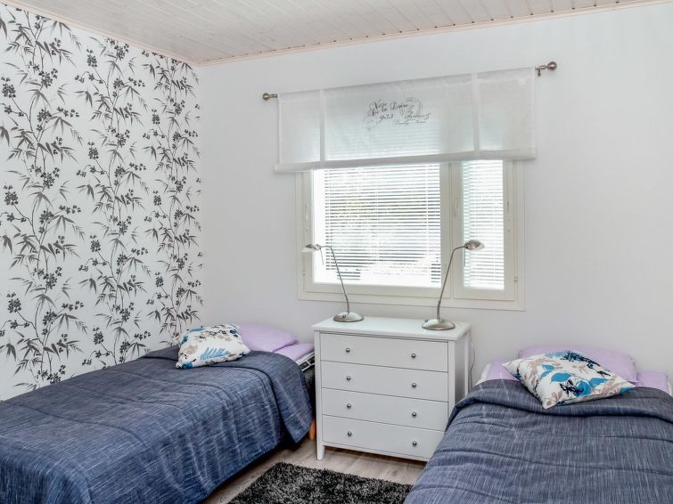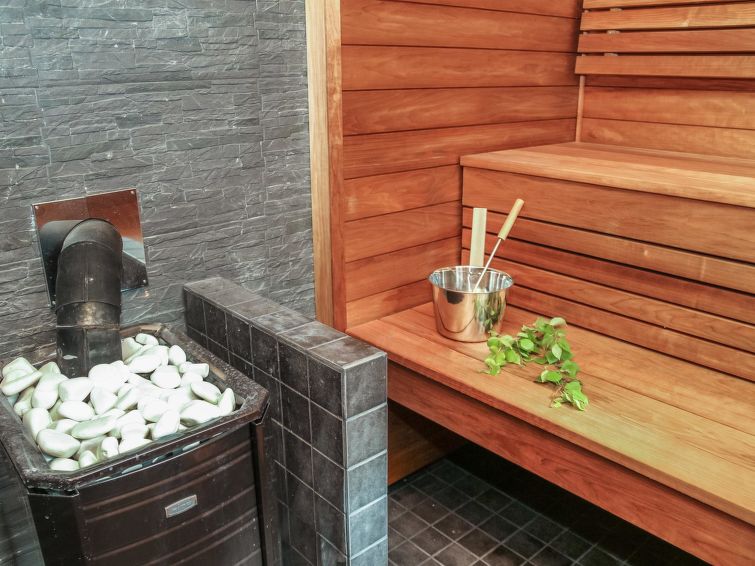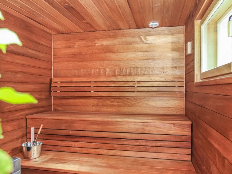 Wooden cabin 2013, living room/kitchen, bedroom (10 m²) two beds, bedroom (10 m²) two beds, sleeping loft (18 m², floor area approx. 40 m²) four beds, dressing room, washroom, sauna, separate WC.