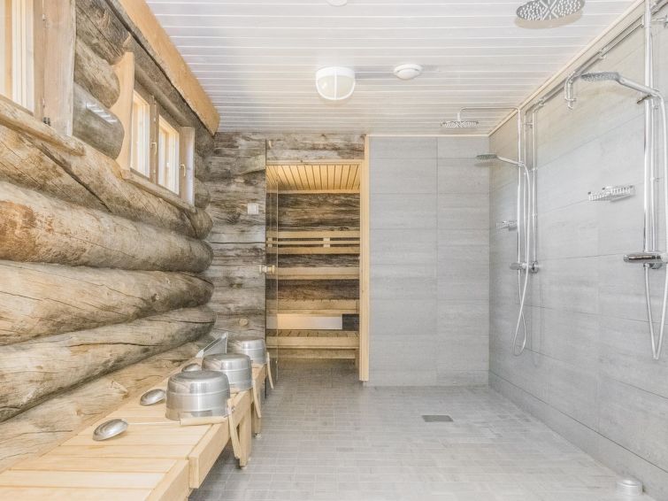Built in 1988, the 220 square meter silver log cabin has a kitchen/living room, 6 bedrooms, dressing room, sauna, washroom and 6 toilets.