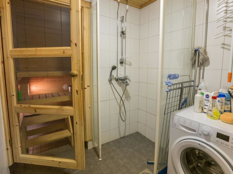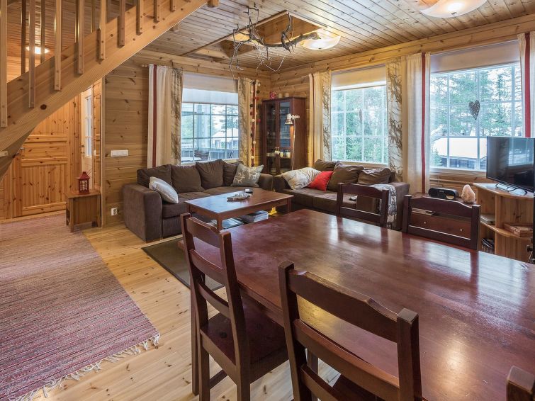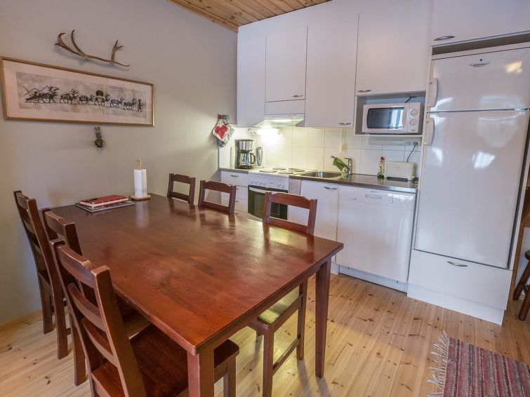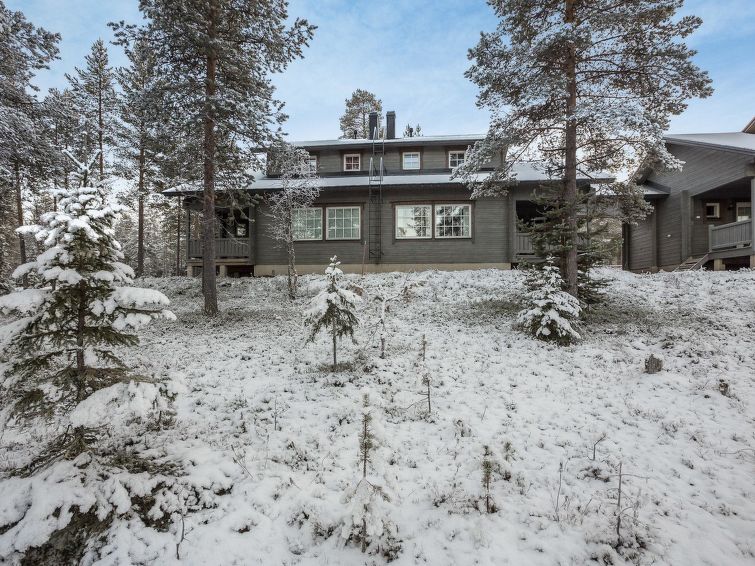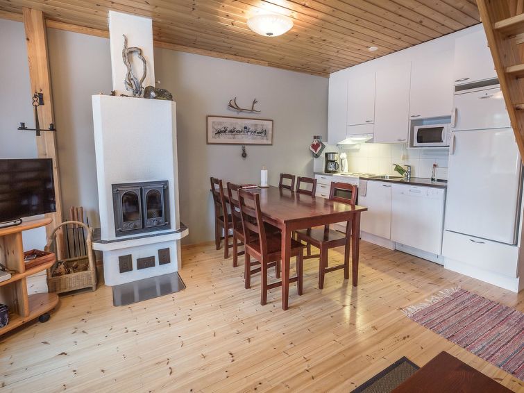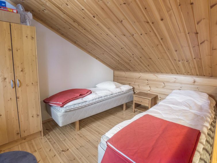 40 km north of Kolari, lake Äkäslompolo 1 km, swimming beach 2,5 km. Log semi-detached house apartment 2006. Livingroom/kitchen, one bedroom with a double bed (can be separated if needed), loft (11 m²) three separate beds, sauna (electric), shower, separate toilet. Homely log semi-detached house apartment in the Äkäslompolo village Peltotieva area. Located in a peaceful and tidy cottage area. Pets are allowed. Extra fee for pets. Prices include final cleaning, bedlinen available for rent.