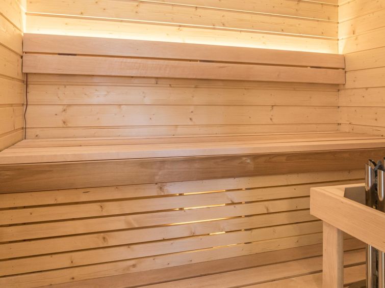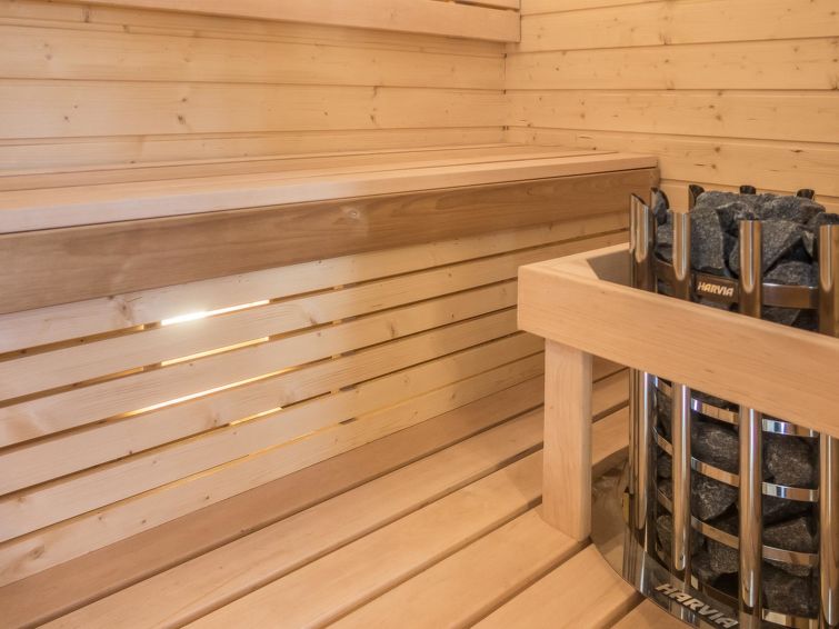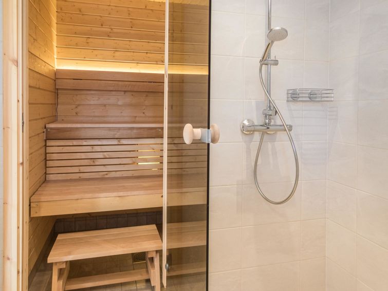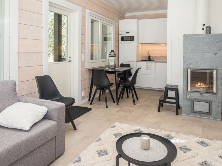 Living room/kitchen and electric sauna. The rental price includes one ski lift ticket to Ruka ski resort.