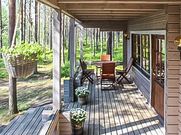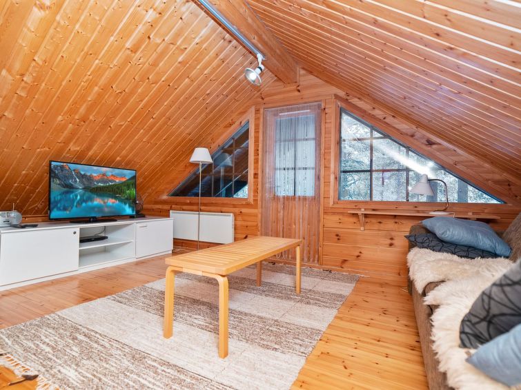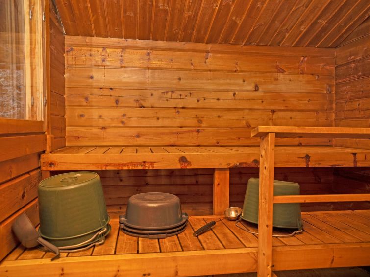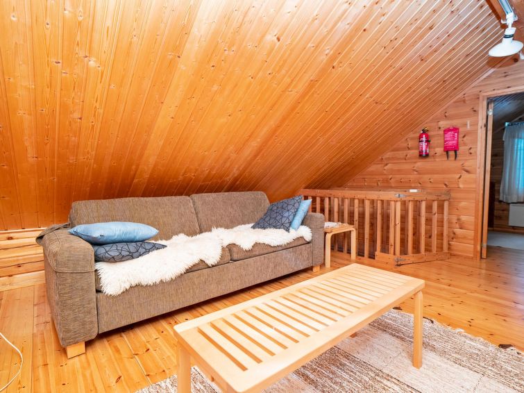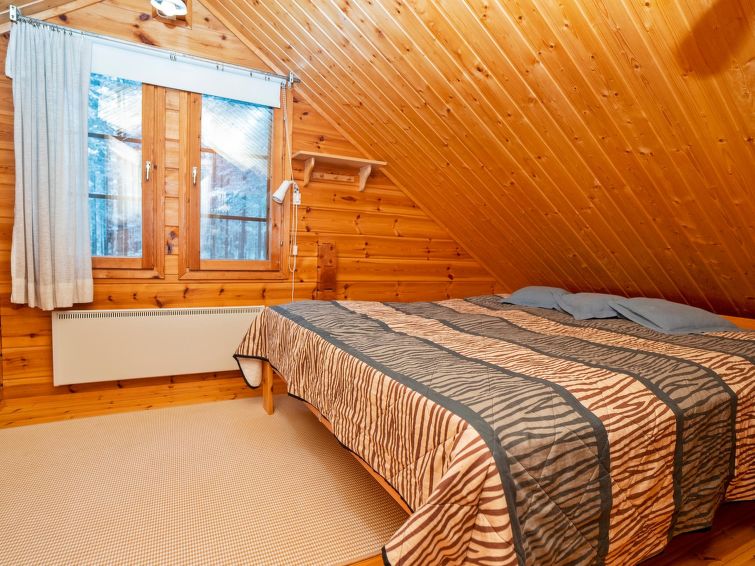 Log cottage, built 1989, Downstairs: living room/kitchen and bedroom with double bed. Upstairs: bedroom with double bed, convertilble bed for 2 in bedroom/lounge, washroom, sauna (electric stove), open porch and balcony.
