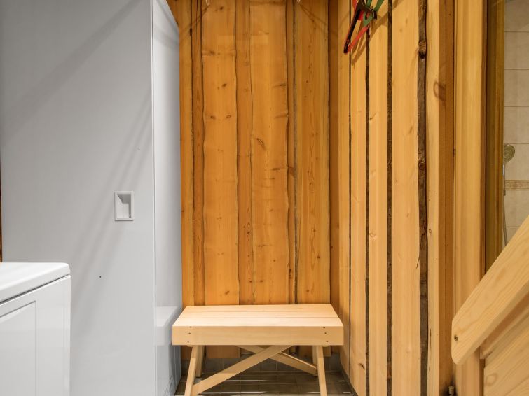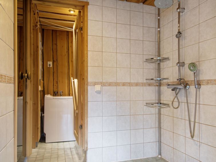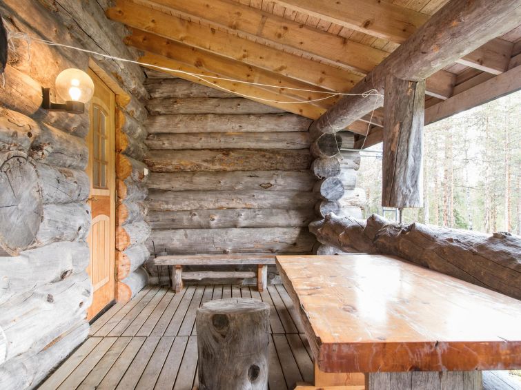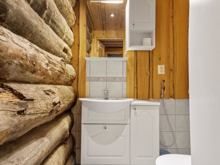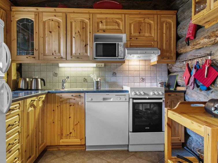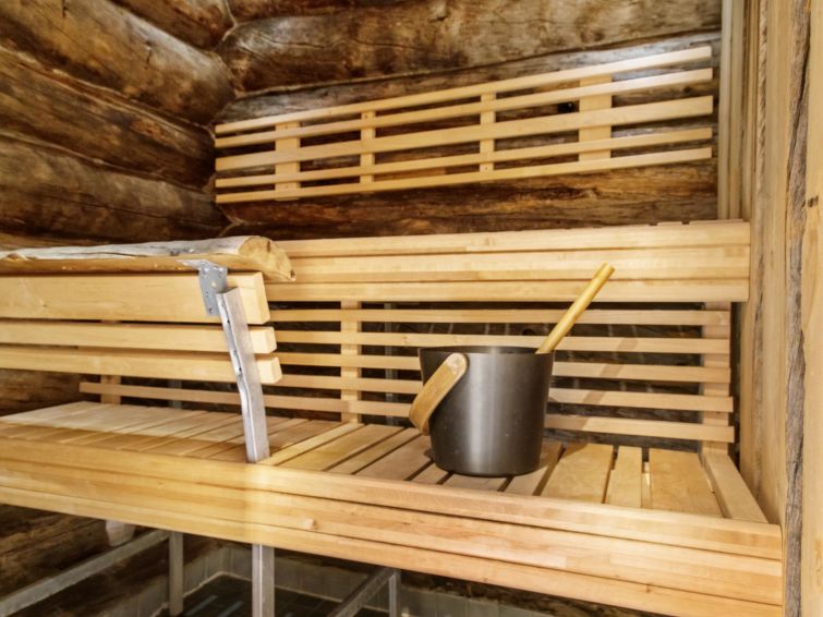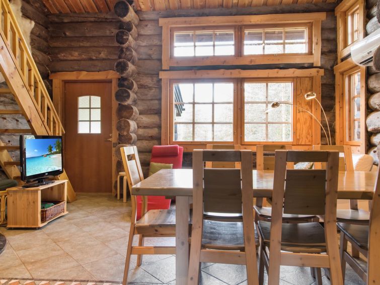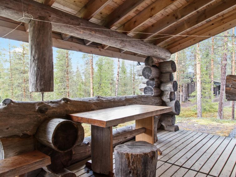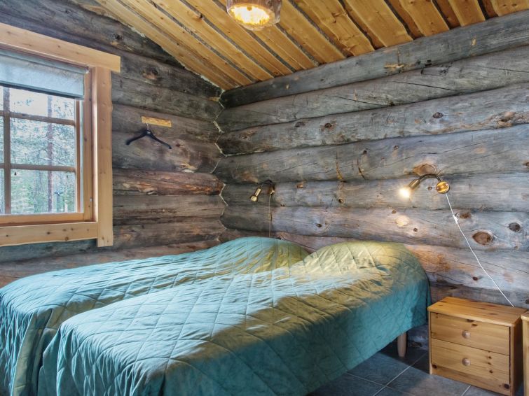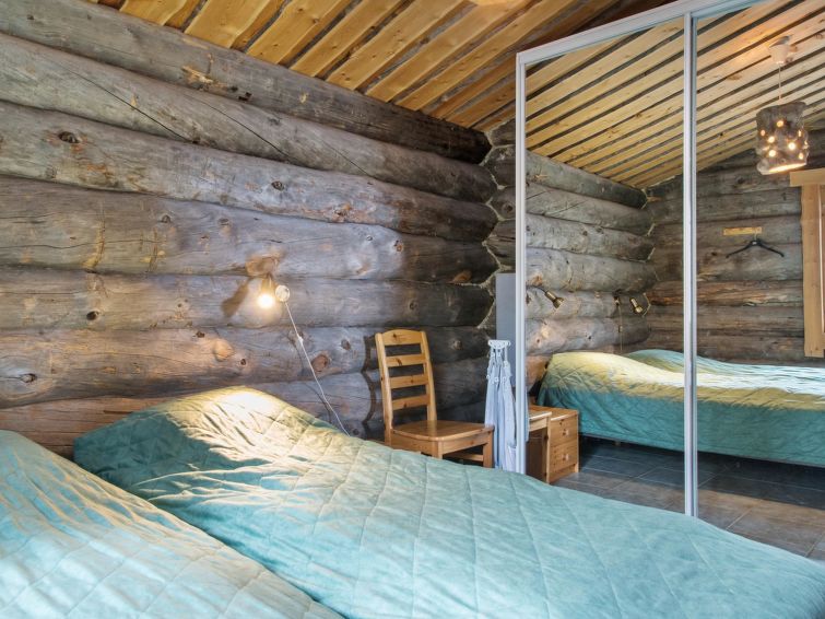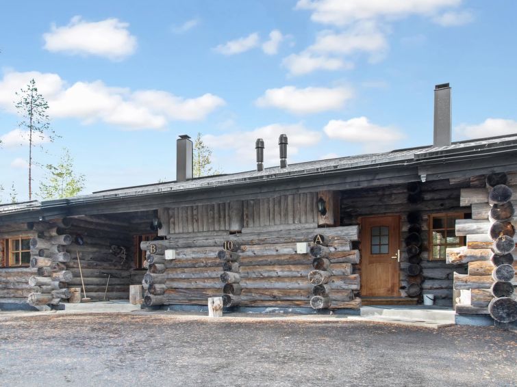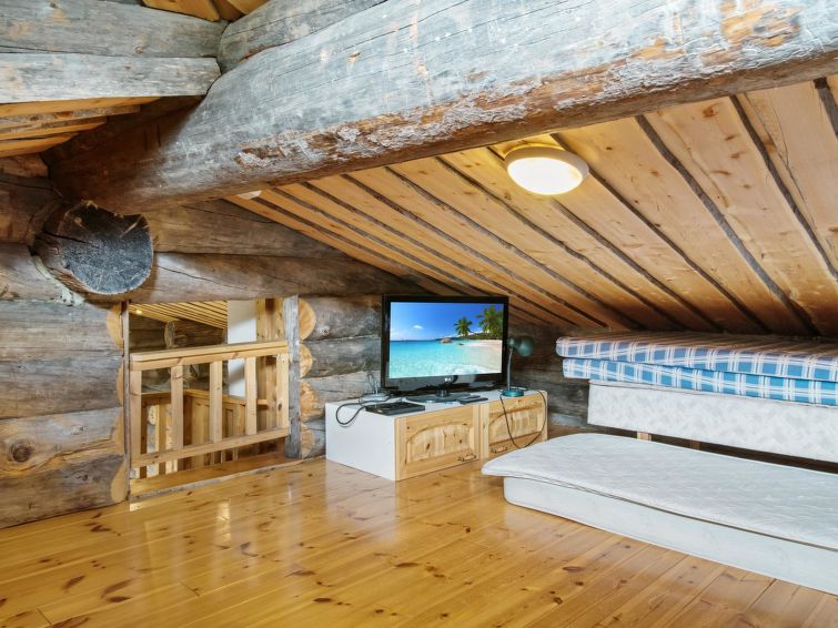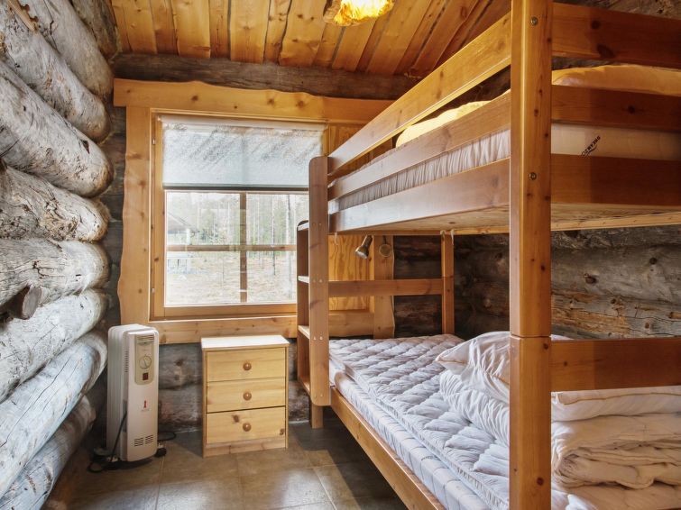 A separate log cottage located 165 km north of Rovaniemi in Ylläsjärvi village Palovaara area. Built 1998. Livingroom/kitchen with bed sofa, two bedrooms (one with a double bed and one with bunk bed, loft (sloping ceilings, low room height, floor area 18 m²) with four mattresses, electric sauna, washing room, storage room, toilet. Final cleaning is included in prices. Bed linen available for rent. Extra fee for pets.