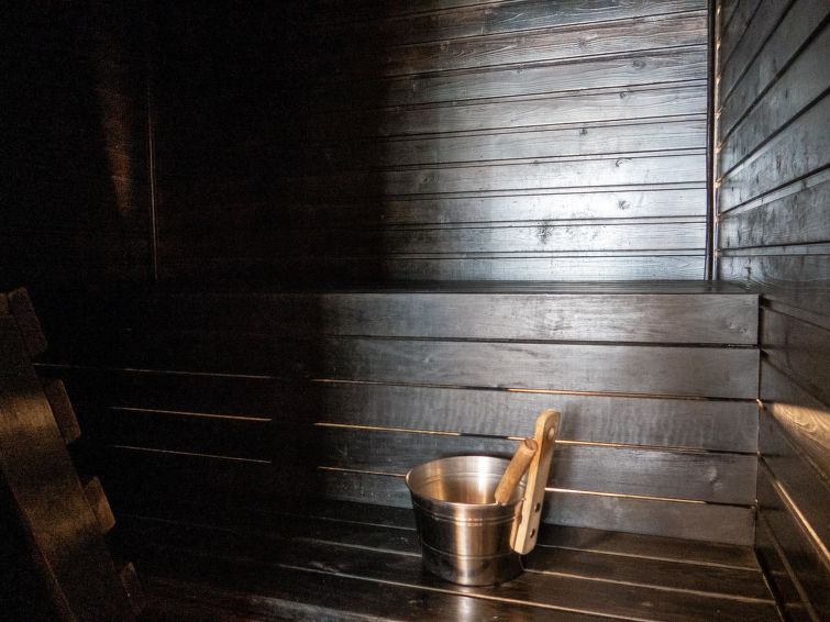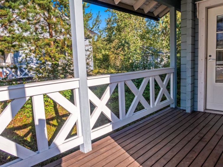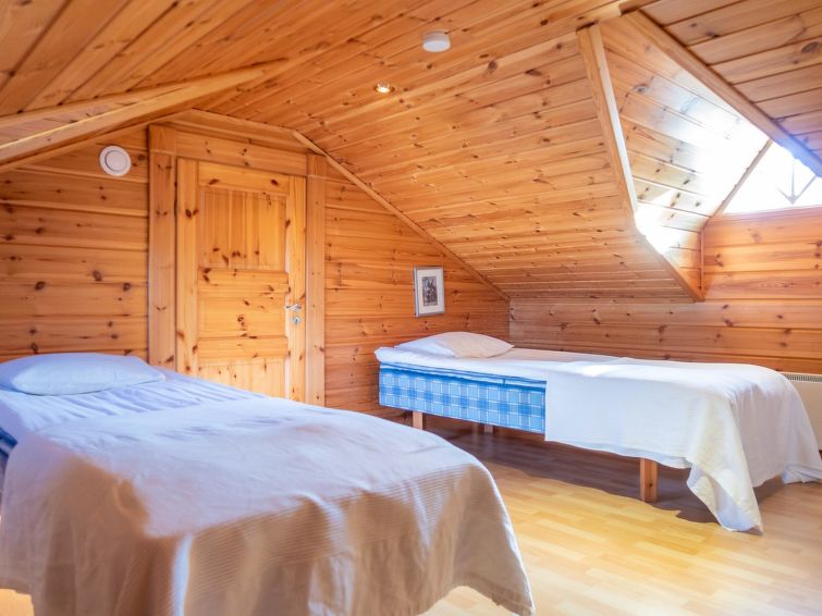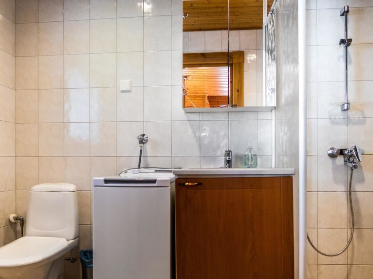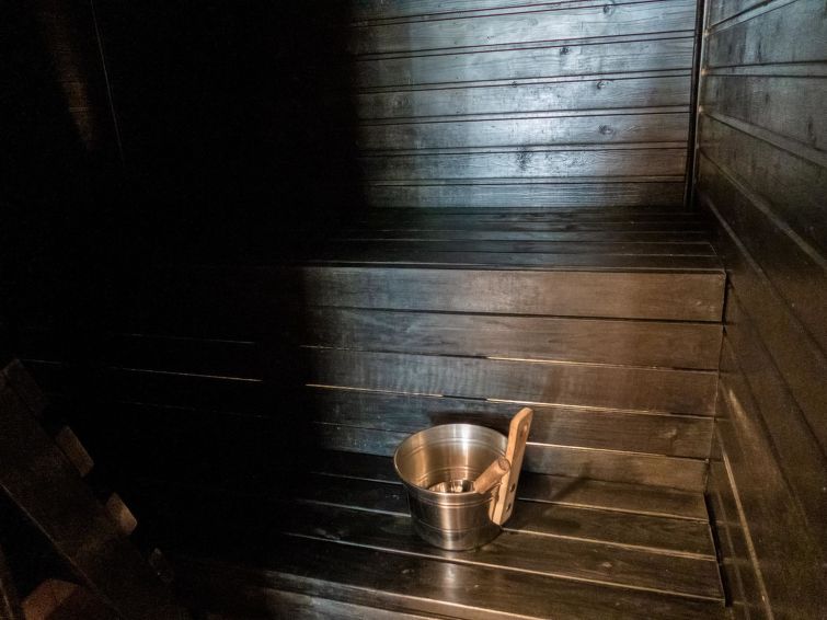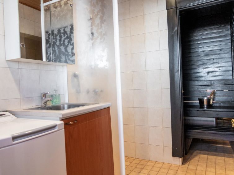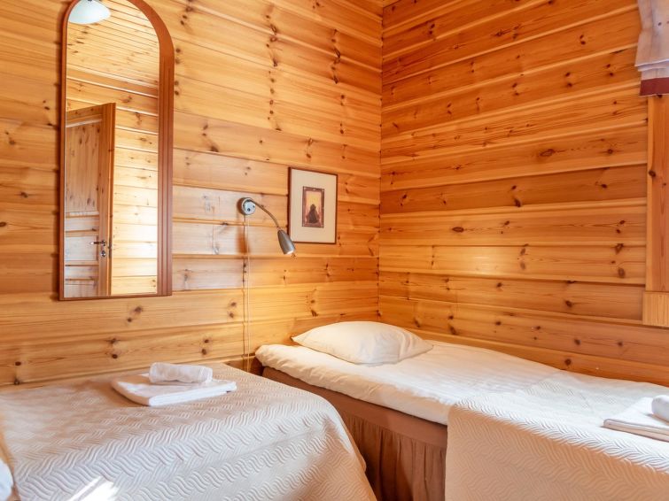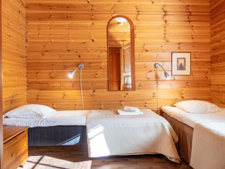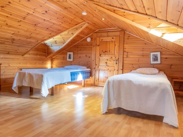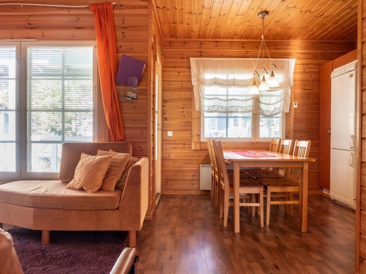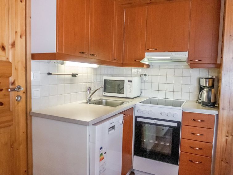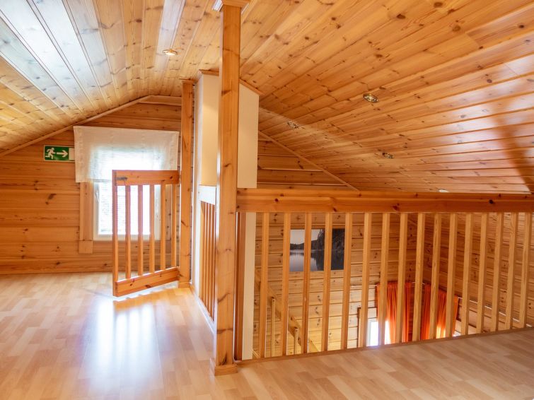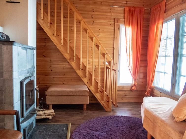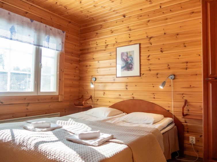 This apartment in log semi-detached house located in Vuokatti ski centre was completed in 2002. Floor area 67m². Combined living room & kitchen, two bedrooms, one with twin bed, the other with separate beds for two, sauna (electric heating), washroom and two toilets. Loft with 2 beds and 2 folding extra beds.