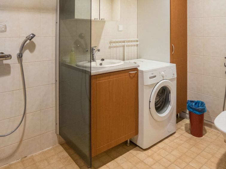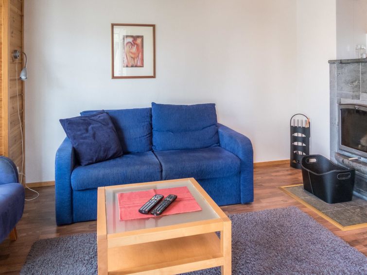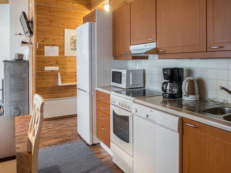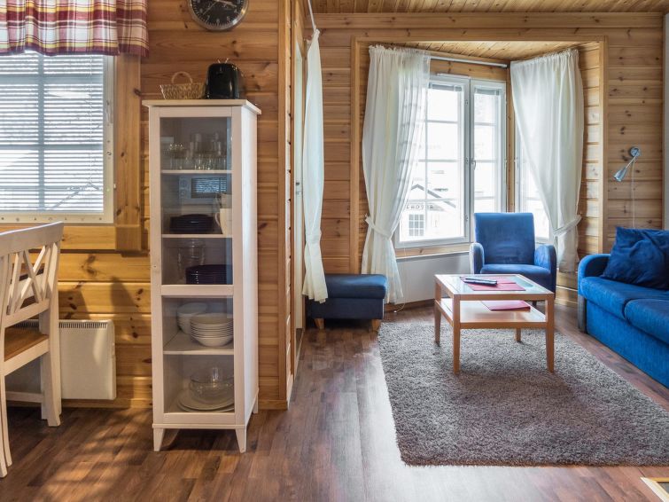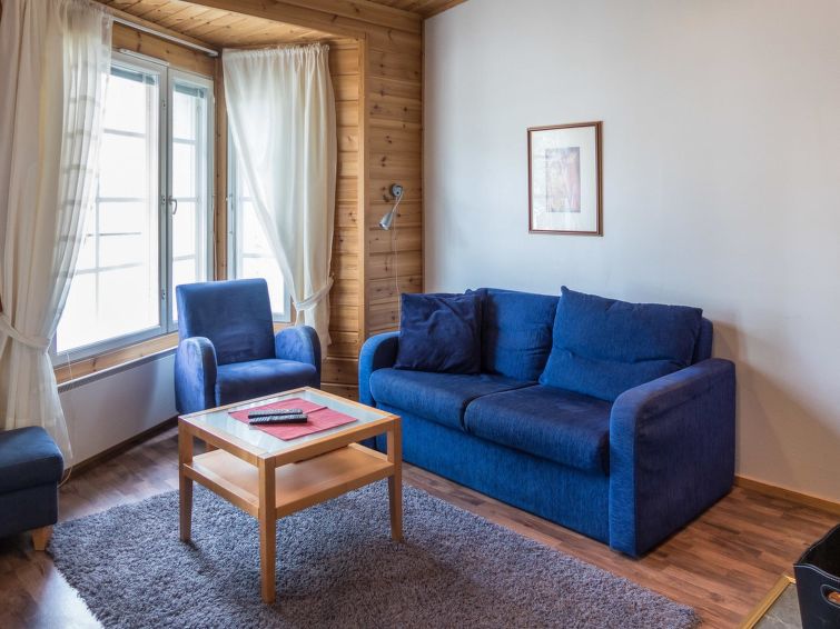 This apartment in log semi-detached house located in Vuokatti ski centre was completed in 2003. Floor area 59m². Combined living room & kitchen with sofa-bed for one person (width 120 cm), two bedrooms, one with twin bed and one with separate beds for two, sauna (electric heating), washroom, two toilets and veranda.