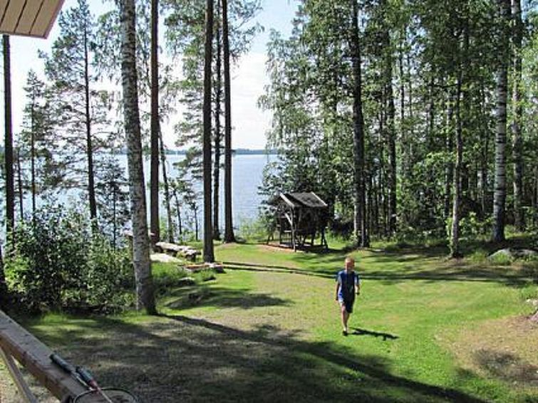 Plot partly in natural state, grass in front of cottage. Shore faces west, neighbours not visible. Near shore is volley ball/badminton court, children’s sand box, garden swing.