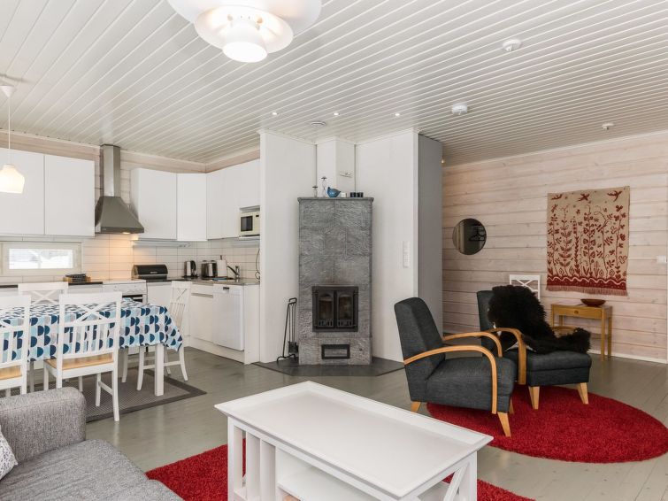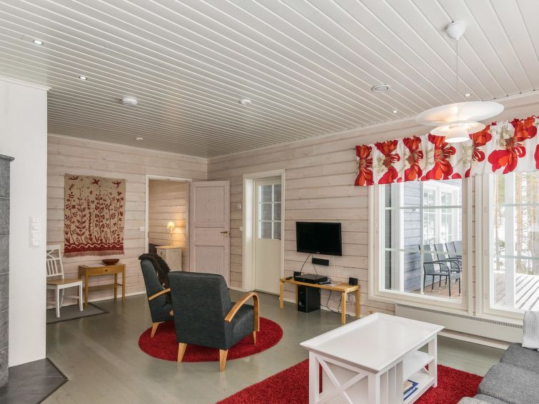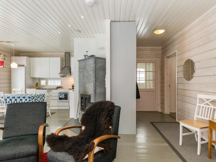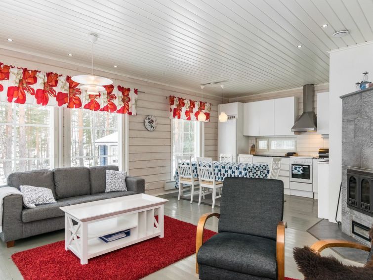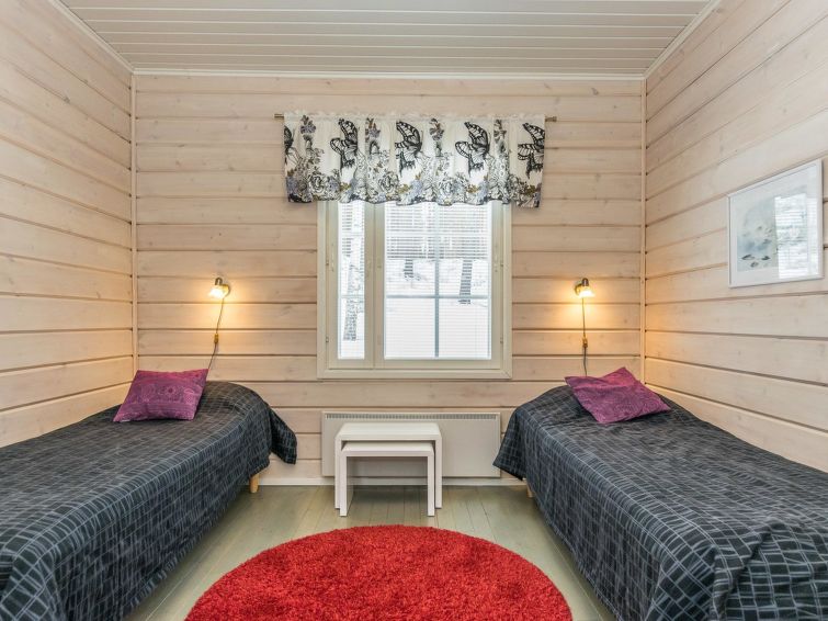 Log building 2011, living room/kitchen (30 m²) with spreadable sofa you can have two alternative beds, two bedrooms (11.5 m²) both have two beds, lobby and WC.