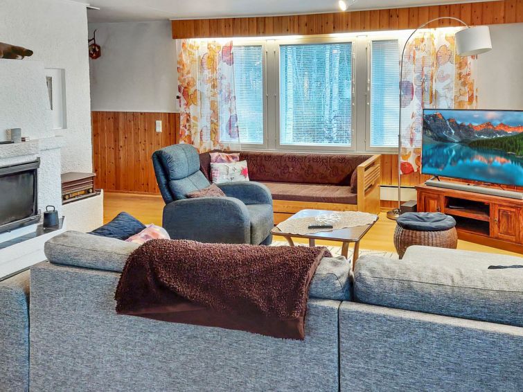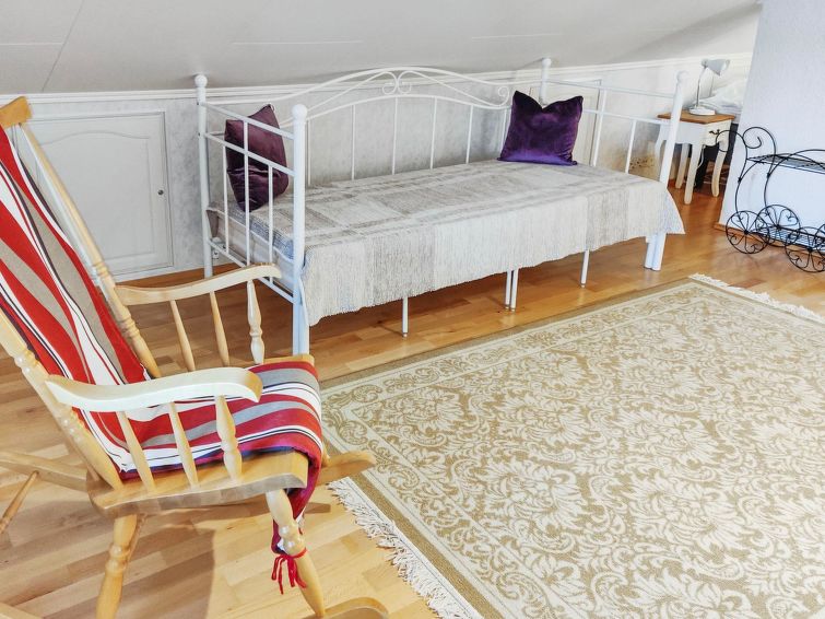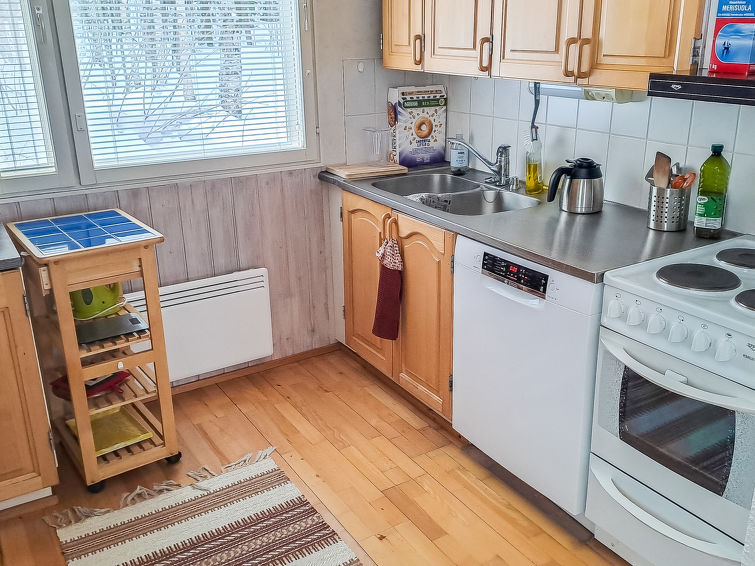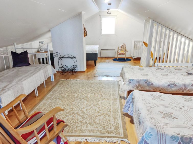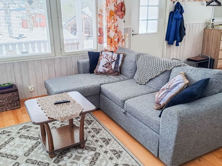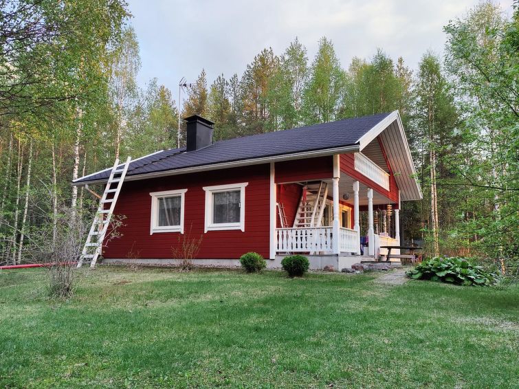 Log paneled cabin, built in 1997. Living room / kitchen with two sofa beds, upstairs a double bed and two single beds (beds are 1 m wide), steep stairs to the loft, washroom / toilet, covered terrace and balcony.