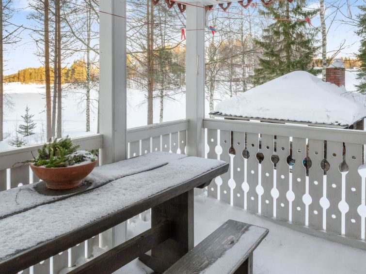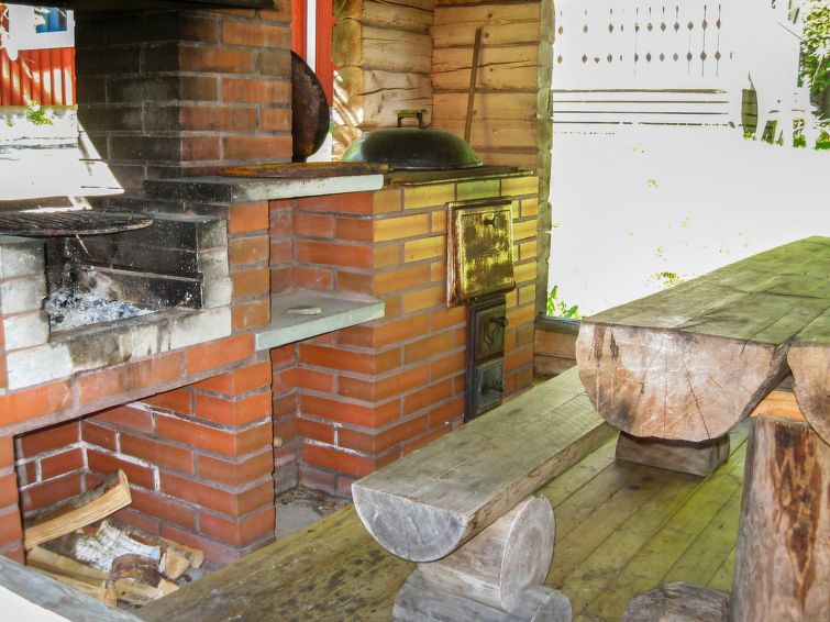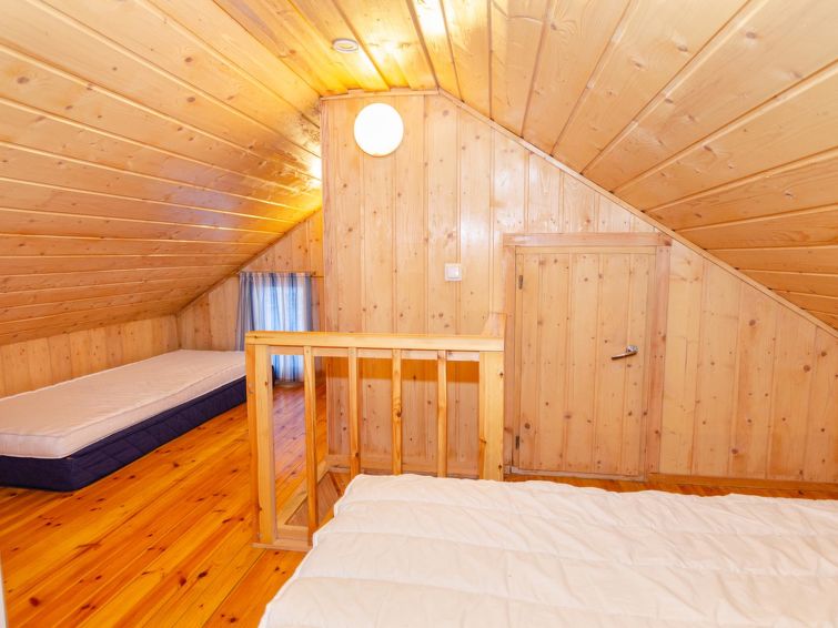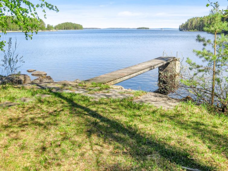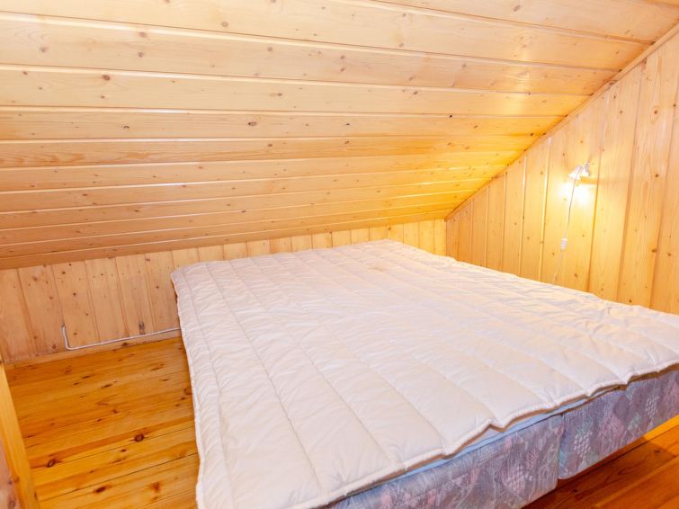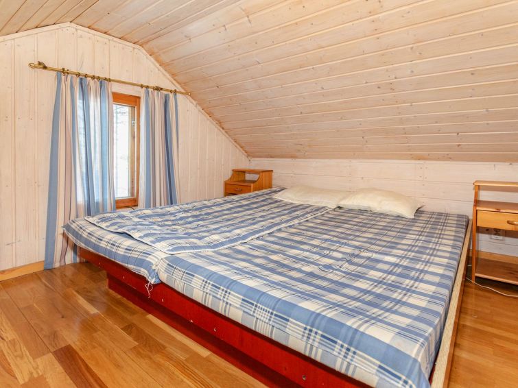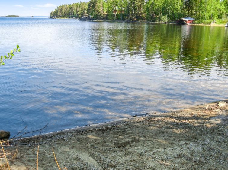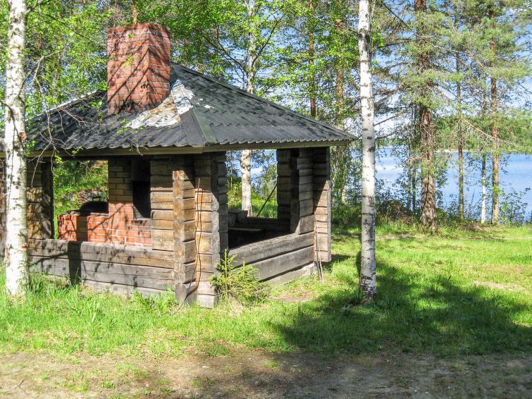 68 km north of Joensuu, L.Pielinen (871,2 km2) 30 m, own shore with shallow sand bottom, own boat. Cottage renovated 2000, kitchen-living room, bedroom with double bed, upstairs small bedroom with small and low door (double bed and mattresses) and sleeping gallery with two beds. Washing room, sauna (wood heated stove) and terrace. The entrance into sauna through the terrace. Well-equipped log panel cottage in peaceful location. Starirs to upstairs are very steep. Good possibilities for fishing, boat motor to be rent separately. Children friendly shore faces west. Separate smoke sauna to be rent separately. covered grill. To snowmobile trail 500 m.