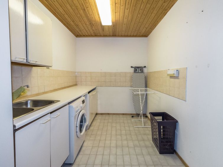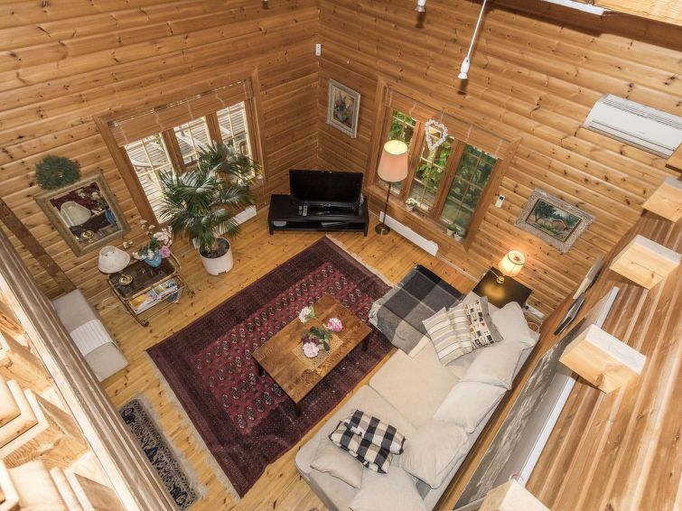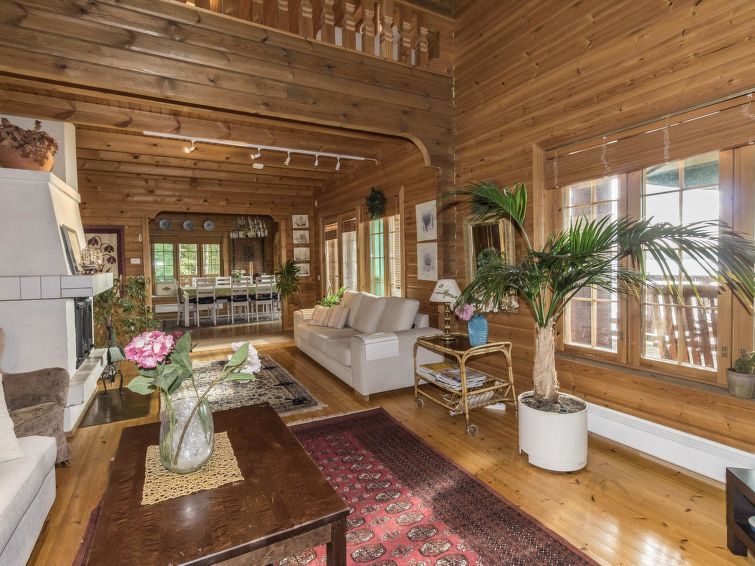 Upstairs: large bedroom with double bed and 2 separate beds. Lounge single bed and convertible sofa/double bed. Downstairs: bedroom two single beds, room with fireplace (home theatre), sauna (electric stove), washroom 2 showers, dressing room, utility room.