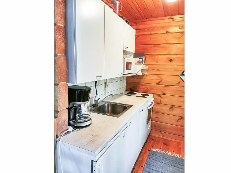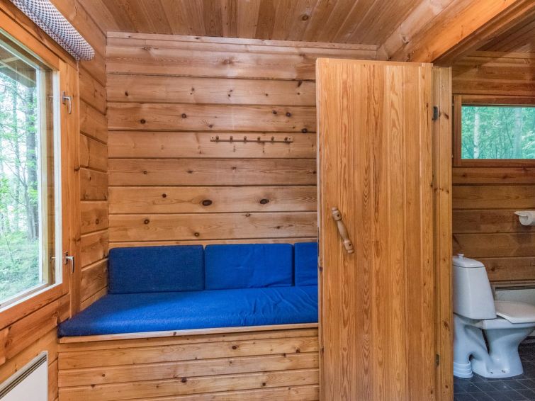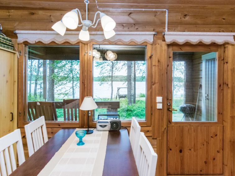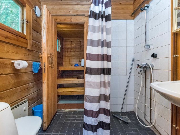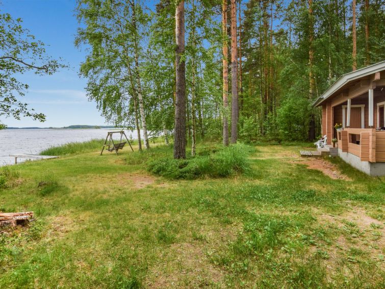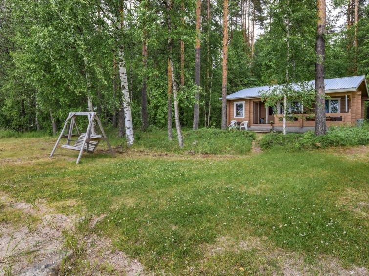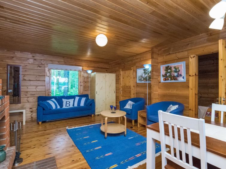 Log house 1983, kitchenette, 2 bedrooms each with 2 beds, living room with 1 bed, sauna (electric), washroom with toilet and shower, porch. Beach suitable for children, nice destination for families.