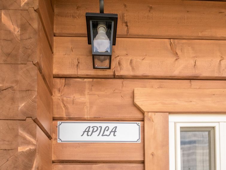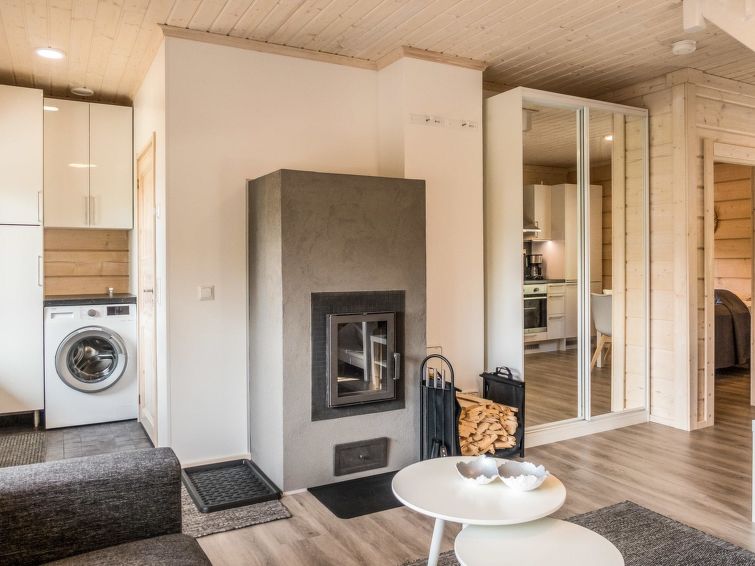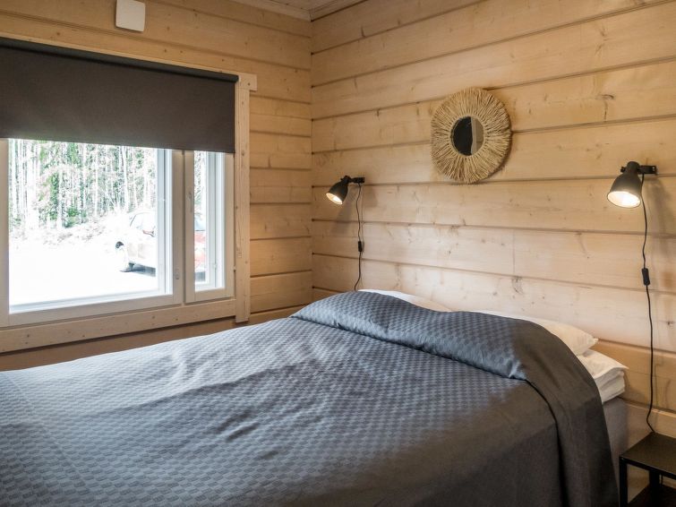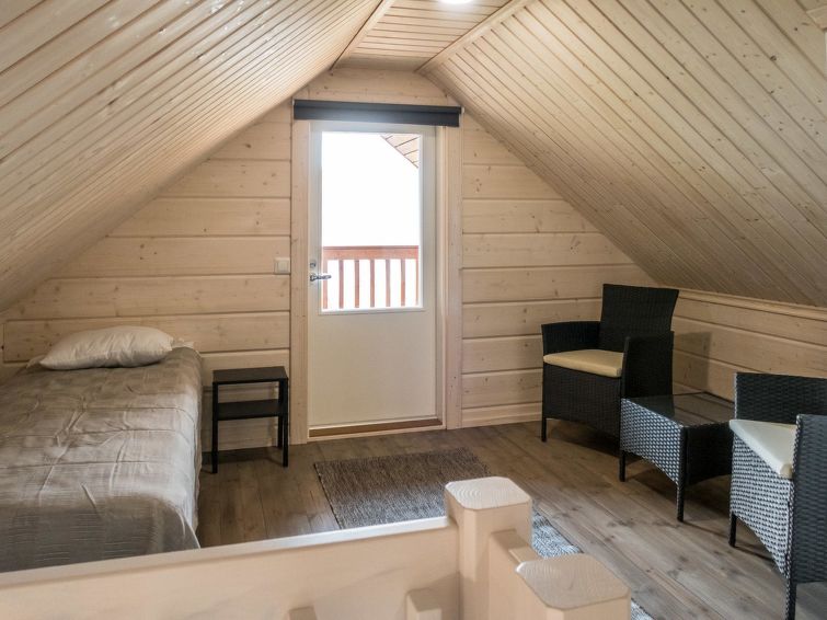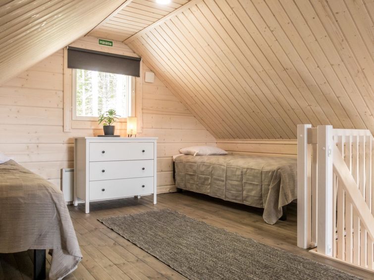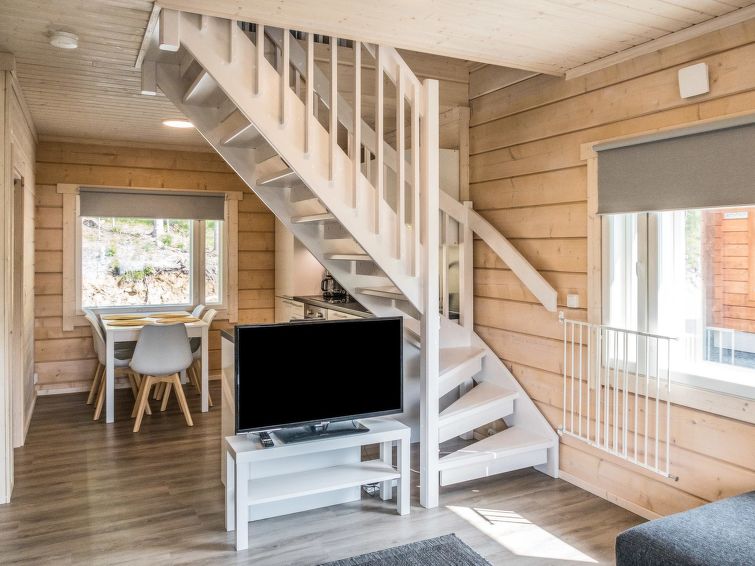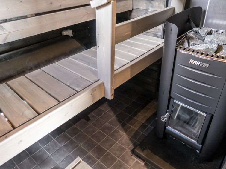 The living area of the cabin is 59 m², including the loft. Living room/kitchen, dining group for 5, heat storing fireplace. On the ground floor, bedroom with double bed, 3 x 80 cm wide beds in the loft. Washroom/WC, wood-burning sauna stove in the sauna.