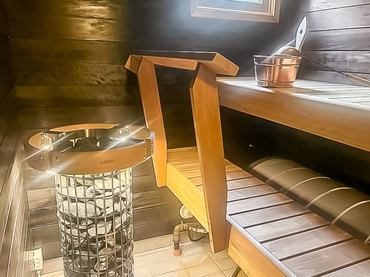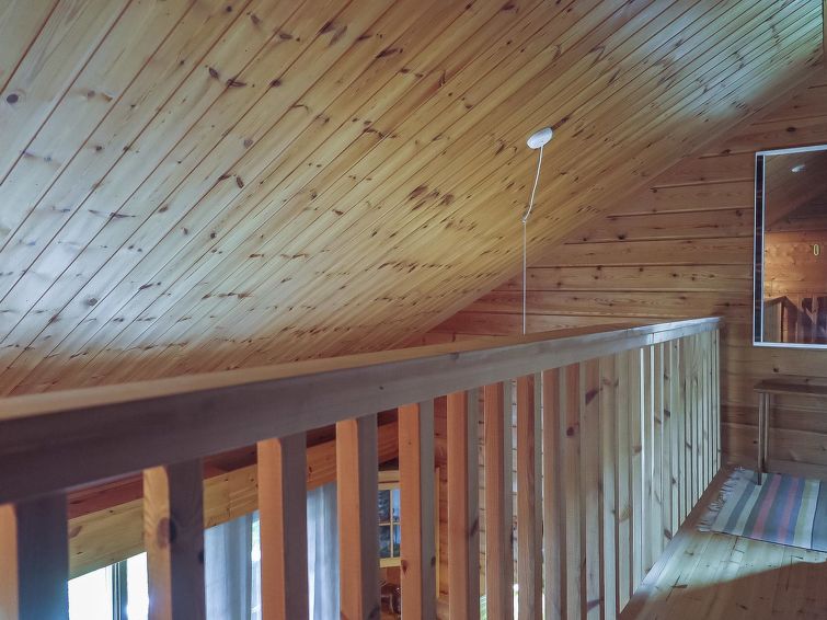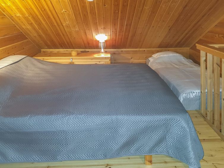 Living room with sofa bed, kitchenette, loft divided to compartments, 2 beds in both departments, sloped ceiling, sauna, washroom, separate WC, open veranda, storeroom.