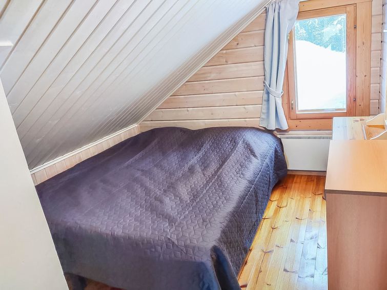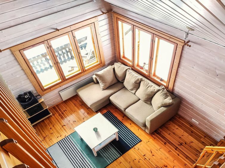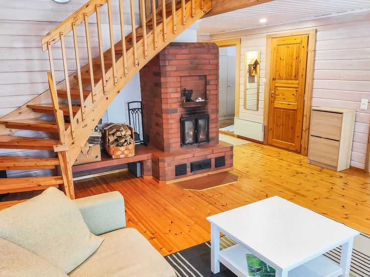 Log cabin 75 m²: on the ground floor living room, living room/kitchen, bedroom (120 cm wide bed), electric sauna, shower, separate WC.
