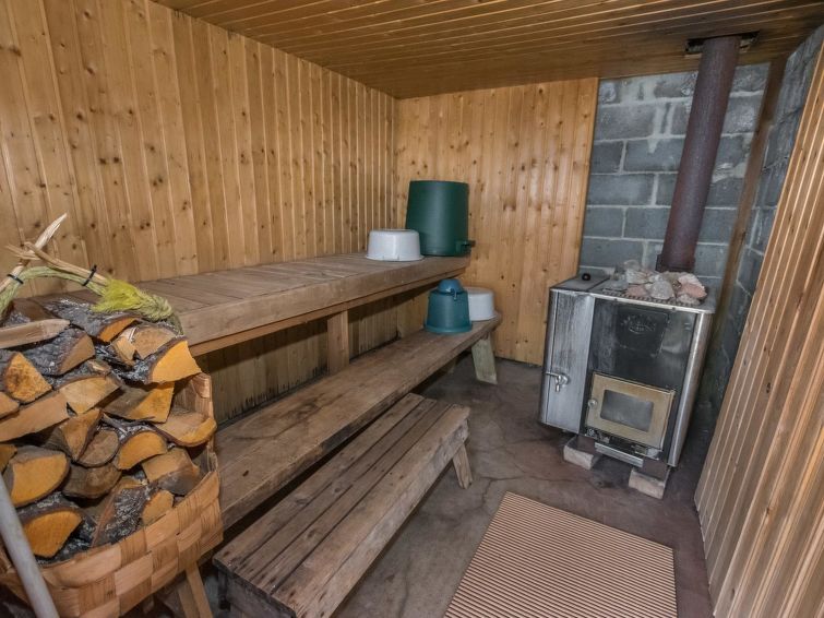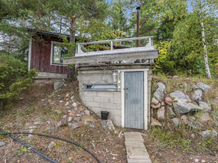 Separate lakeshore sauna (25 m²), with steam room, dressing room with fireplace. There are several cottages and lakeshore saunas in the area. Distance from the cottage to the neighbour cottage is 100 m, distance from the lakeshore sauna to the neighbour cottage is 40 m. Heater as electric heating. Cottage stands on top of rather high bedrock, from which view towards Mynälahti bay. Separate sauna building on shore, also sauna in basement, terrace, room with fireplace and bedroom with extra sleeping space for 2 persons. There is a cottage road between the cottage and lakeshore sauna. Access to the lakeshore sauna is by the road. Cottage swimming shore is not the best for small children, but there is a shore suitable for children nearby.