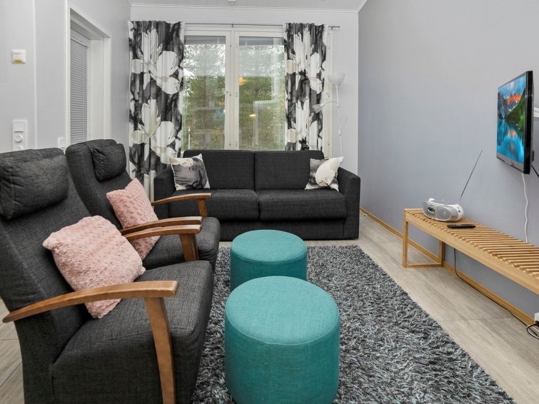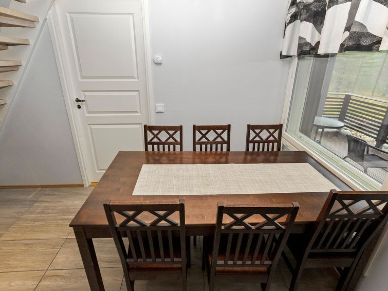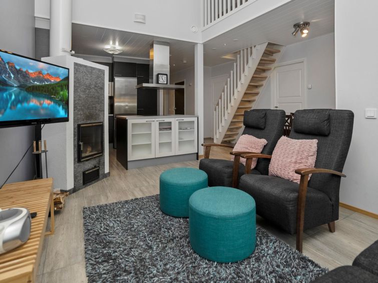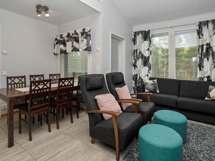 21 km north of Kuusamo, Ruka 6.7 km, Hirsilampi pond 200 m, Pyhäjärvi -lake 300 m. Apartment in terraced house, built in 2013, bedroom 1: double bed, bedroom 2: 2 beds, living room: sofabed for 2, loft: 2 matresses, combined kitchen/living room, electric sauna. Comfortable apartment in terraced house middle of the nature.