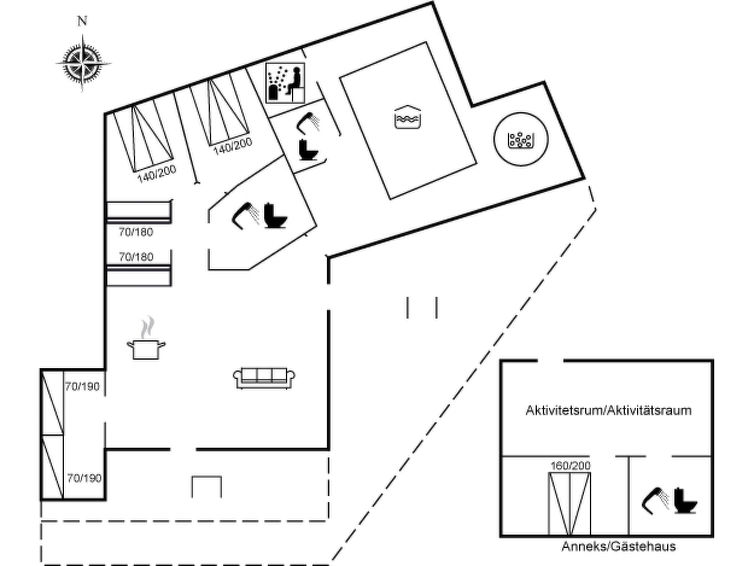 Enmannsbolig, bygget i 2003. 400 m fra sjøen. Privat: uberørt tomt 1'250 m2, innendørs pool (2 x 4 m, 1'1.8 m2, dybde 110- 110 cm dyp). Grill, lekeplass (huske). I huset: badstu, vaskemaskin, tørketrommel. Parkering ved hbrukt. Daglivarehandel 1 km. Eieren godtar ikke noen ungdomsgrupper.