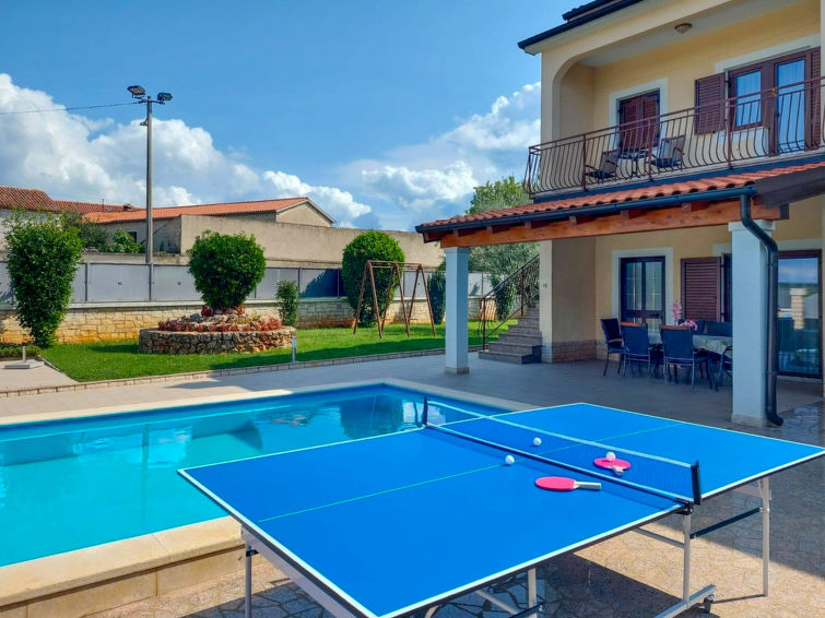 Enmannsbolig "Kristina (KST411)", med 2 etasjer. I det lille tettstedet Radovani 11 km fra sentrum av Kaštelir, 5 km fra sentrum av Višnjan, 13 km fra sentrum av Poreč, 13 km fra sjøen. Privat: tomt 800 m2 (inngjerdet) med plen og trær, svømmebasseng kantete (8 x 4 m, dybde 150 cm, Sesongåpent: 27.Mar. - 05.Nov.) med innebygde trapper. Utendørs dusj, terrasse (16 m2), hagemøbler, grill (huske), Underholdning av bassenget av eieren/gartneren. I huset: internetilkobbling, vaskemaskin. Parkering (for 2 biler) ved hbrukt på tomten. Butikk 5 km, småstenstrand 13 km. Vennligst merk: velegnet for barnefamilier. Eieren godtar ikke noen ungdomsgrupper. Huset består av 2 leiligheter, leies som en enhet. Hver leilighet har utvendig og separat inngang.