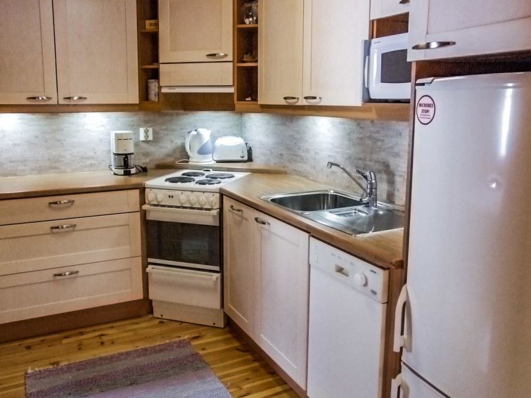 14km north of Kuusamo, Ruka 15km, Lake Pikku-Nissijärvi 30m, sandy beach, mud bottom off beach, pier. Log cottage, built in 1992, bedroom 1: double bed, bedroom 2: double bed, loft (30 m², maximum height 185 cm): 3 beds + bunk for 2 persons, living room, kitchen, electric sauna.
