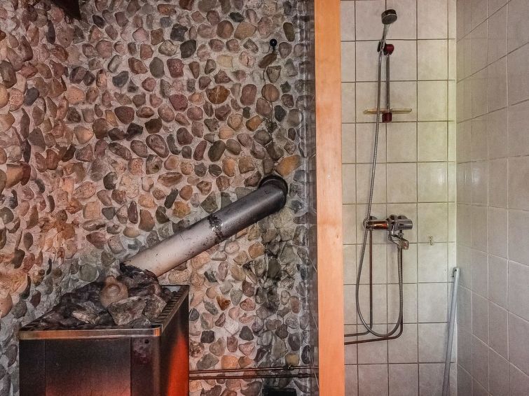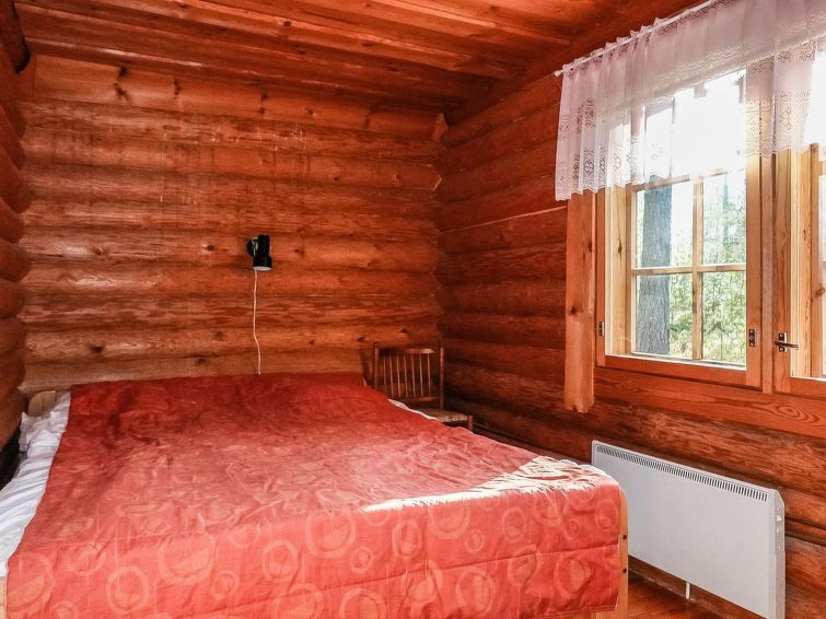 Log cottage, built in 1992. Living room-kitchen sofa bed, bedroom with double bed, second bedroom with 2 single beds, loft with 2 mattresses (loft is low and stairs steep), sauna with wood stove, shower in the steam room, separate toilet and large covered terrace on the river side.