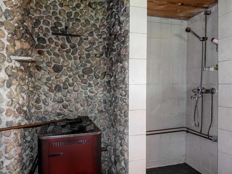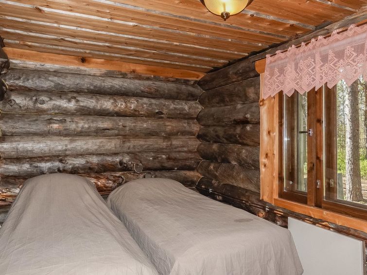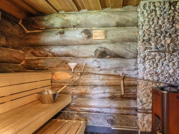 Log cottage, built in 2006. Living room-kitchen with wooden sofa bed, 2 bedrooms both with 2 single beds, loft with 2 mattresses (loft is low and stairs steep), sauna with wood stove, shower in the steam room, separate toilet and large covered terrace on the river side.